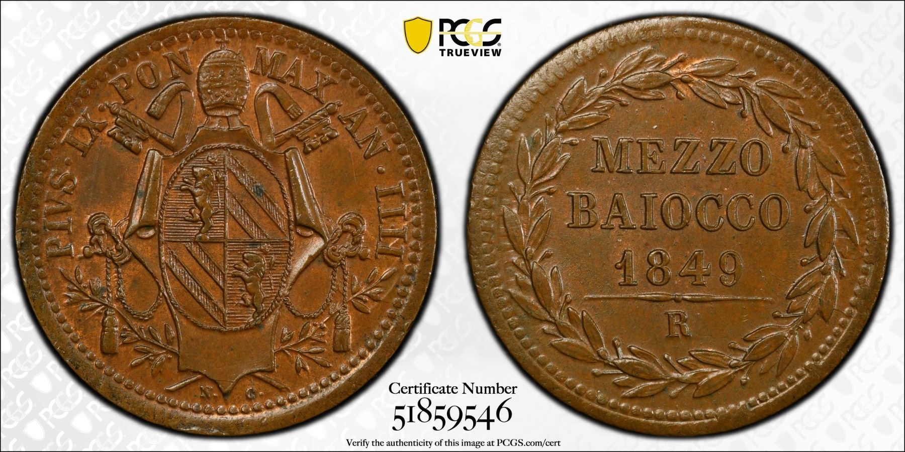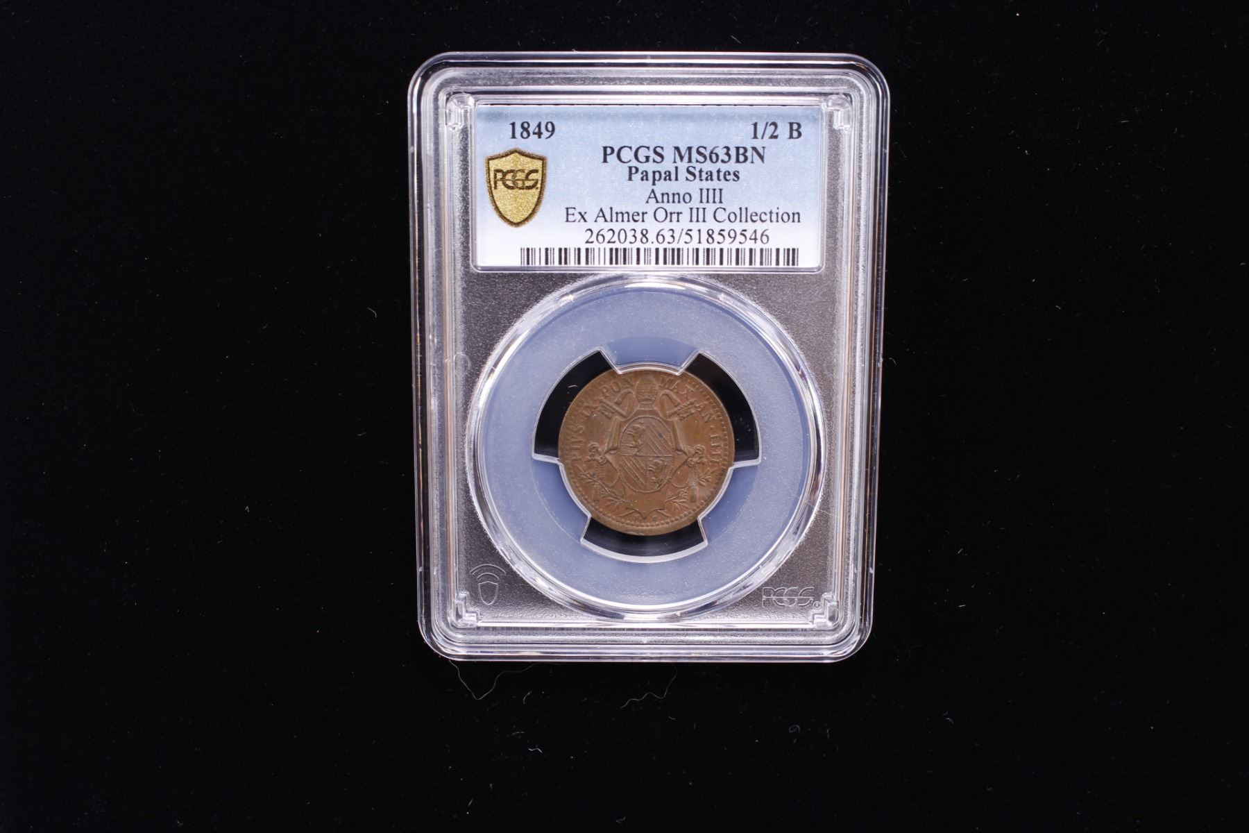 PAPAL STATES: Pius IX, 1846-1878, AE 1/2 baiocco, Rome, 1849-R year IIII, KM-1340, a lovely example, PCGS graded MS63 BN, ex Almer H. Orr III Collection.