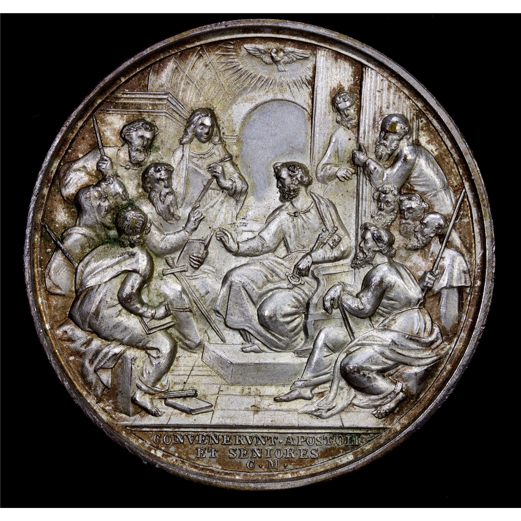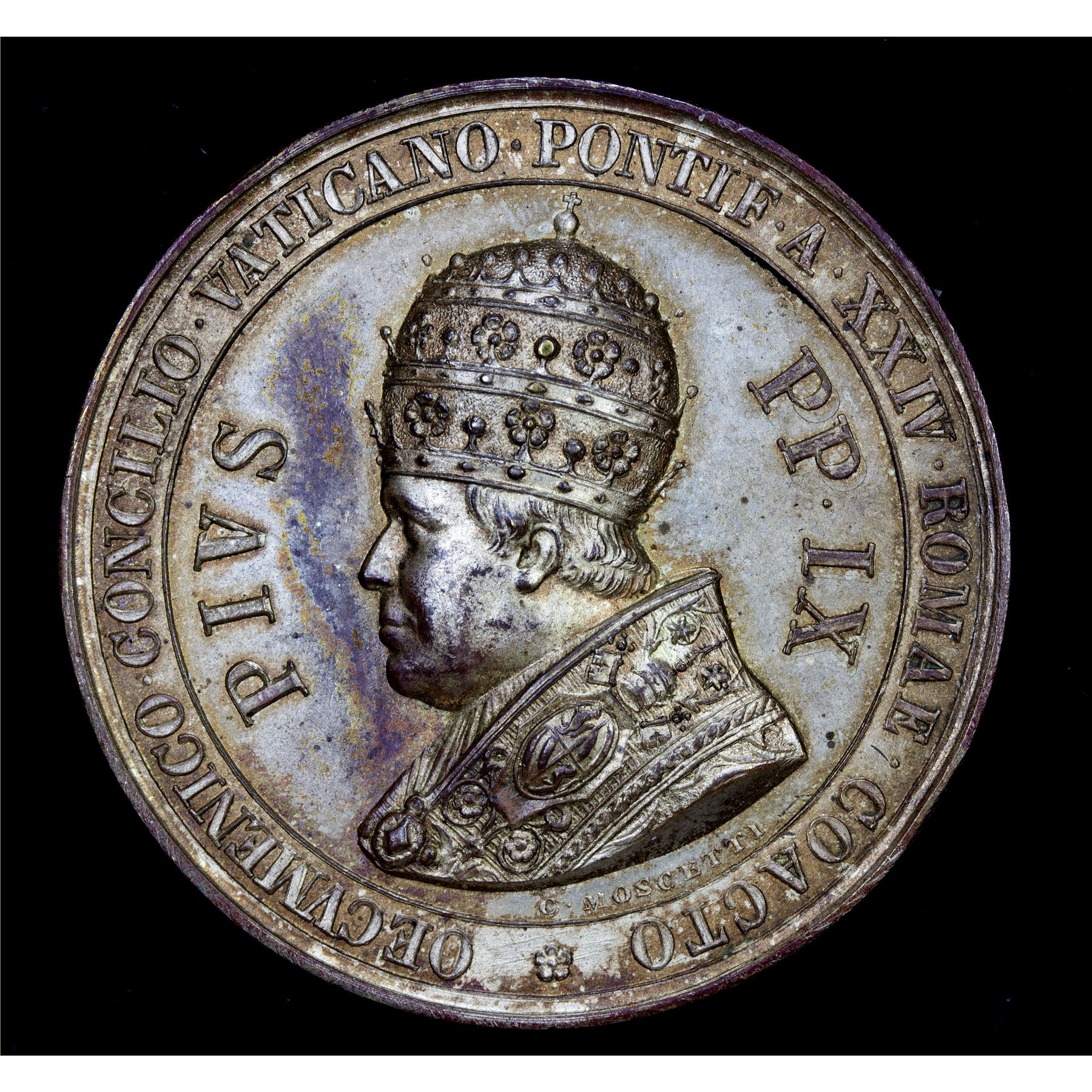 PAPAL STATES: Pius IX, 1846-1878, AE medal (30.41g), ND (1869), Bartolotti-XXV, 12, 43mm silvered bronze medal for the 24th Ecumenical Counsel by Carlo Moscetti, bust left with PIVS - PP. IX around, all inside inner circle with "OECVMENICO.CONCILIO.VATICANO.PONTIF.A.XXIV.ROMAE.COACTO (rosette)" around // the 12 apostles in discussion with radiant dove above and CONVENERVNT.APOSTOLI / ET SENIORES / C.M. in exergue, unevenly toned, plain edge, AU, R.