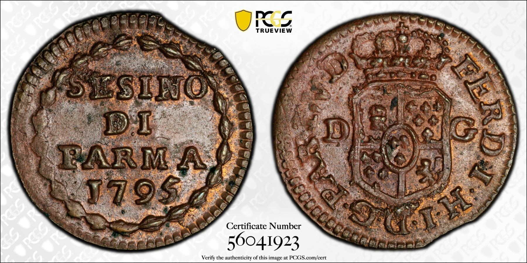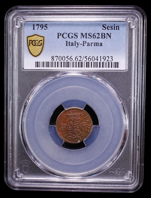 ITALY: PARMA: Ferdinand I, 1765-1802, AE sesino, 1795, PCGS MS62 BN