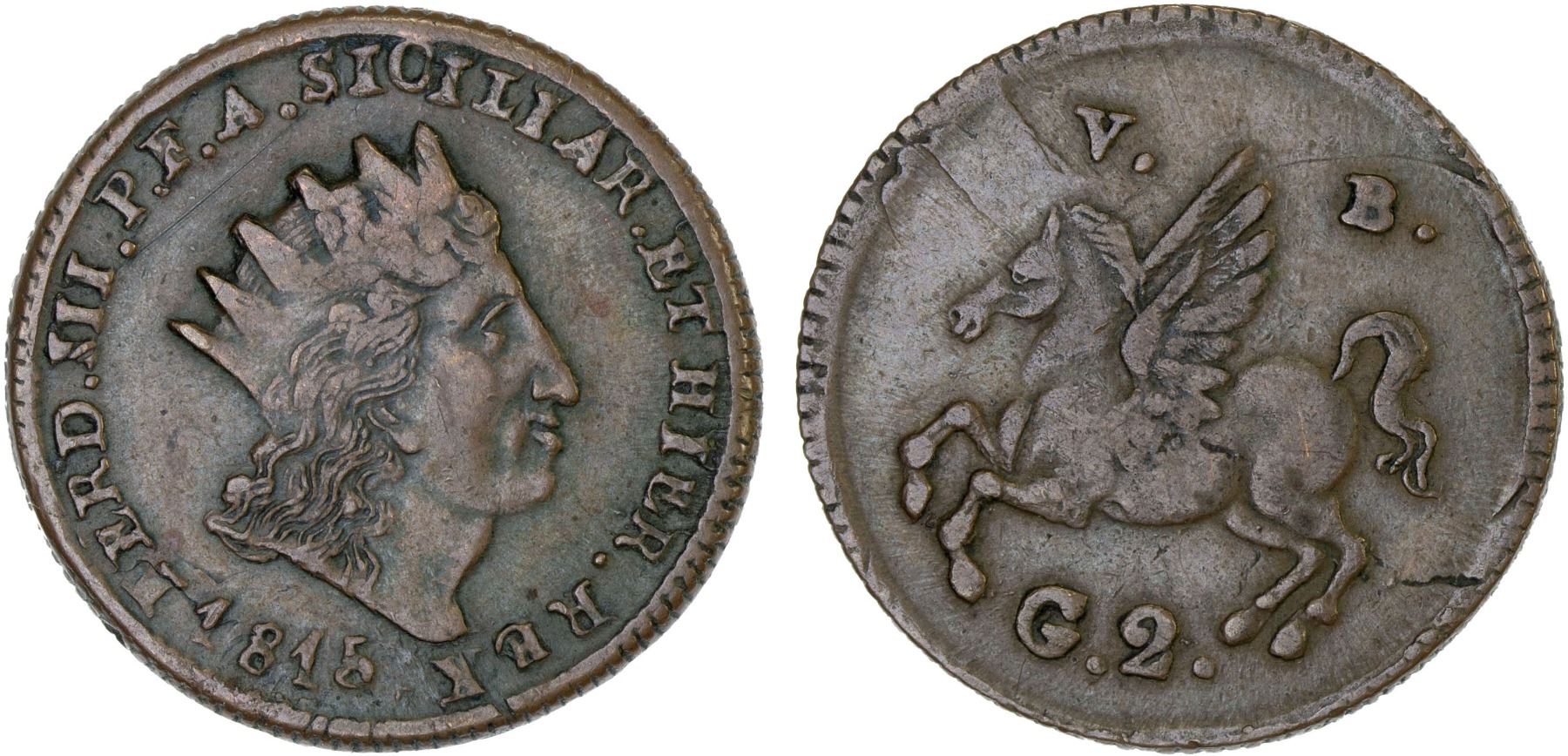 SICILY: Ferdinando III, 3rd reign, 1814-1816, AE 2 grani, 1815, KM-249, initials VB, crowned head // Pegasus, trace of undertype, VF-XF.