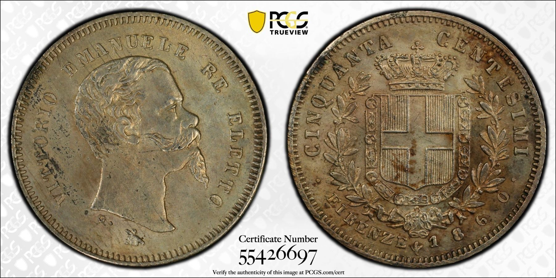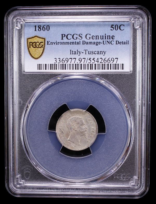 TUSCANY: Victor Emmanuel II, 1859-1860, AR 50 centesimi, 1860, KM-11, some carbon spots / environmental damage, PCGS graded UNC details.