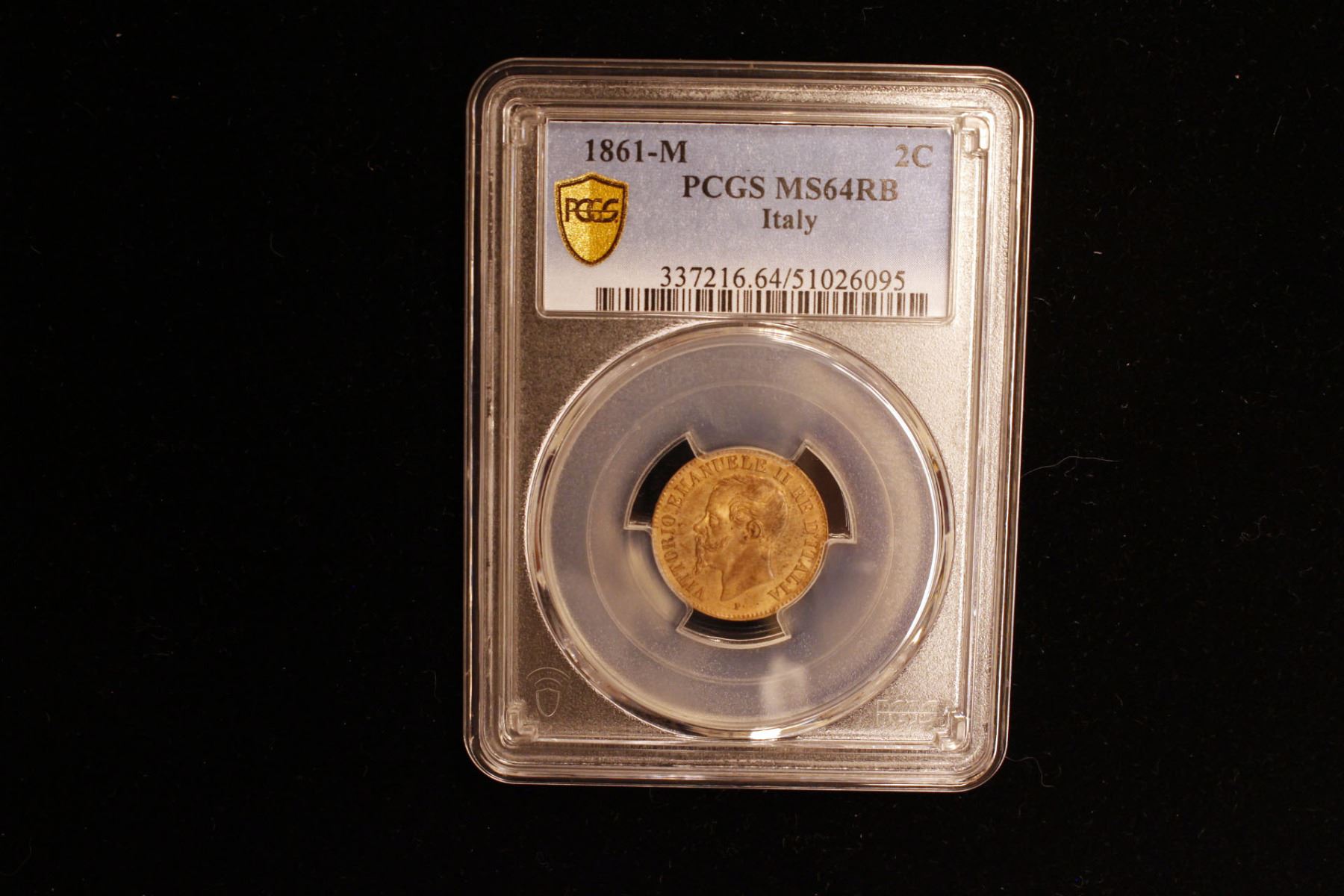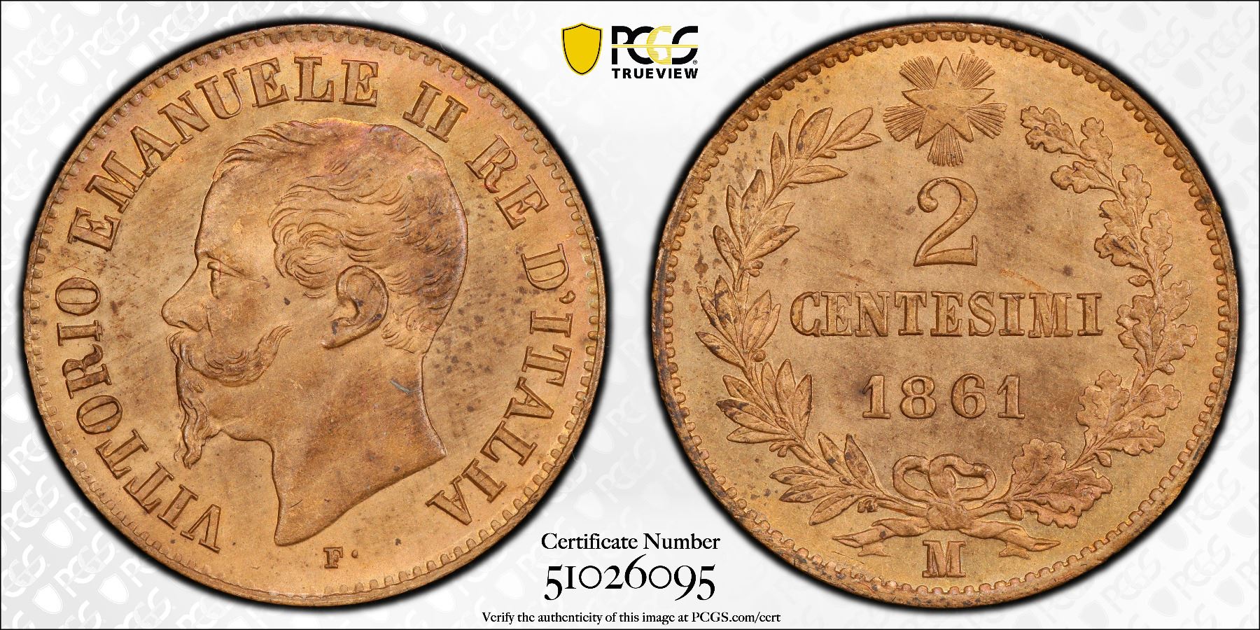 ITALY: Vittorio Emanuele II, 1861-1878, AE 2 centesimo, 1861-M, PCGS MS64 RB