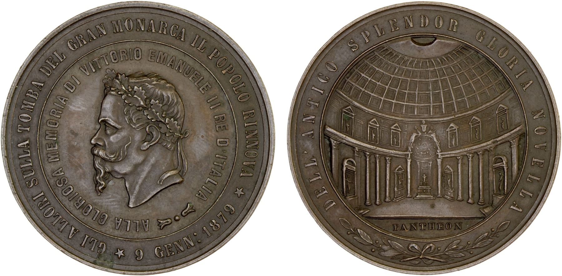 ITALY: Vittorio Emanuele II, 1861-1878, AE medal (26.67g), 1878, 40mm medal for the first anniversary of the entombment of the late king at the Pantheon, laureate bust left, ALLA GLORIOSA MEMORIA DI VITTORIO EMANUELE II RE D'ITALIA / GLI ALLORI SULLA TOMBA DEL GRAN MONARCA IL POPOLO RINNOVA / 9 GENN: 1879 // interior view of the Pantheon, DELL'ANTICO SPLENDOR GLORIA NOVELLA, small spot on obverse, attractive brown patina, Almost Unc to Unc.