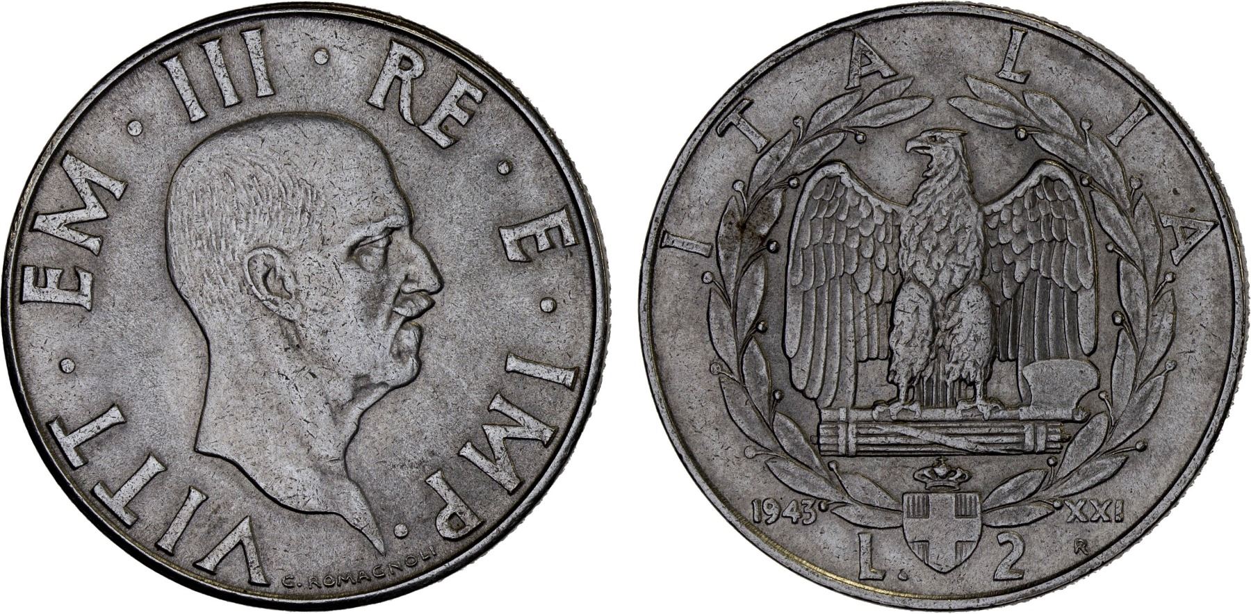 ITALY: Vittorio Emanuele III, 1900-1946, 2 lire, 1943-R, Choice AU