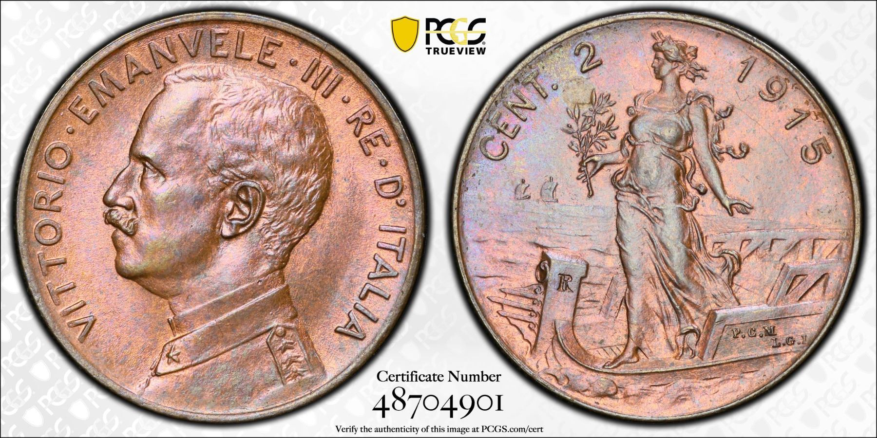ITALY: Vittorio Emanuele III, 1900-1946, AE 2 centesimi, 1915-R, PCGS MS65 RB
