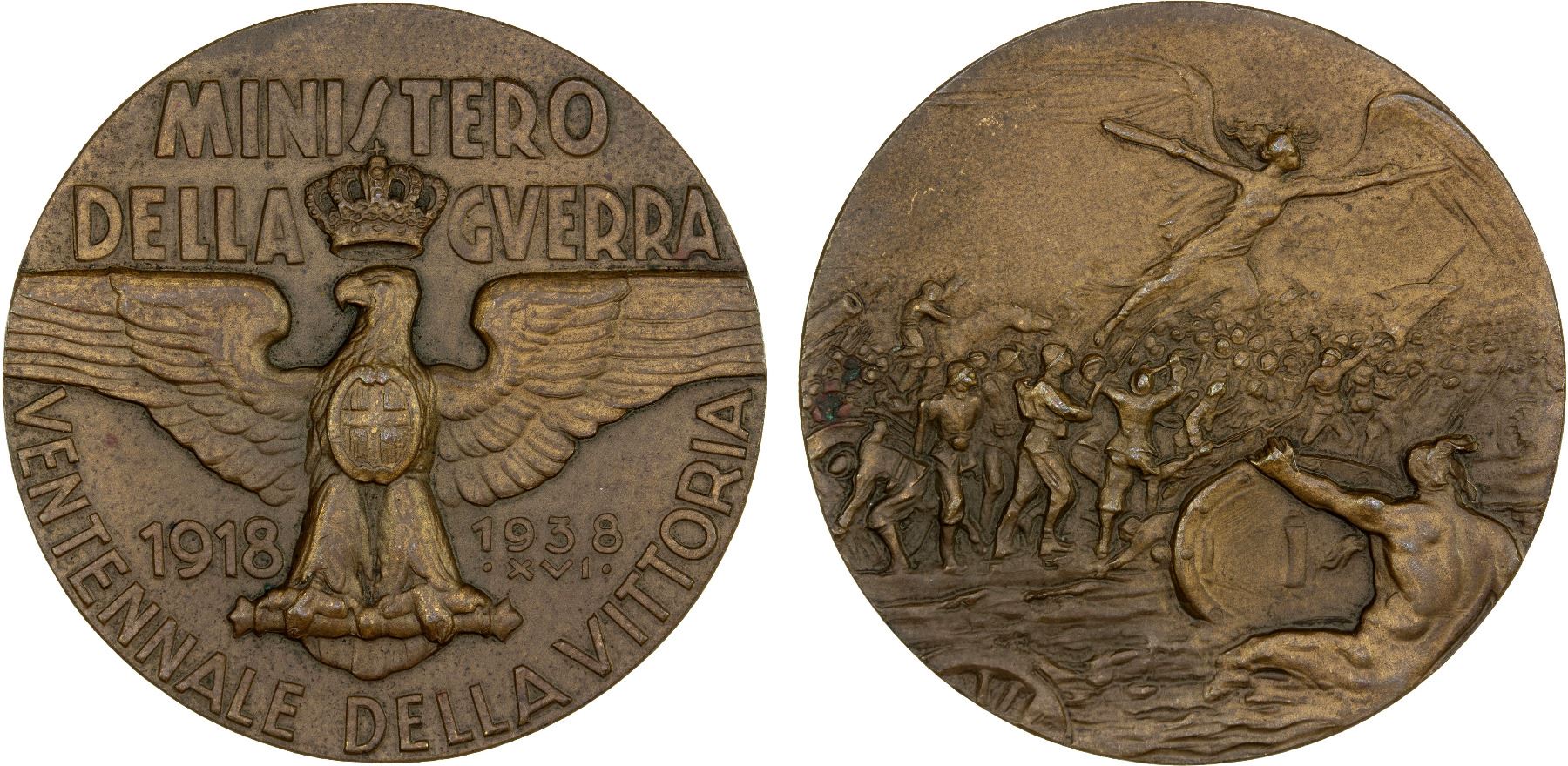 ITALY: Vittorio Emanuele III, 1900-1946, AE medal (27.05g), 1938 year XVI, 40mm bronze medal by Fontana, Lorioli e fratelli Milano - Roma for the 20th Anniversary of Victory in the First World War; MINISTERO DELLA GUERRA above crowned Italian eagle, dates either side, 1918 / 1938 [Era Fascista year] XVI, VENTENNALE DELLA VITTORIA below // Victory leading the Italian army, XF.