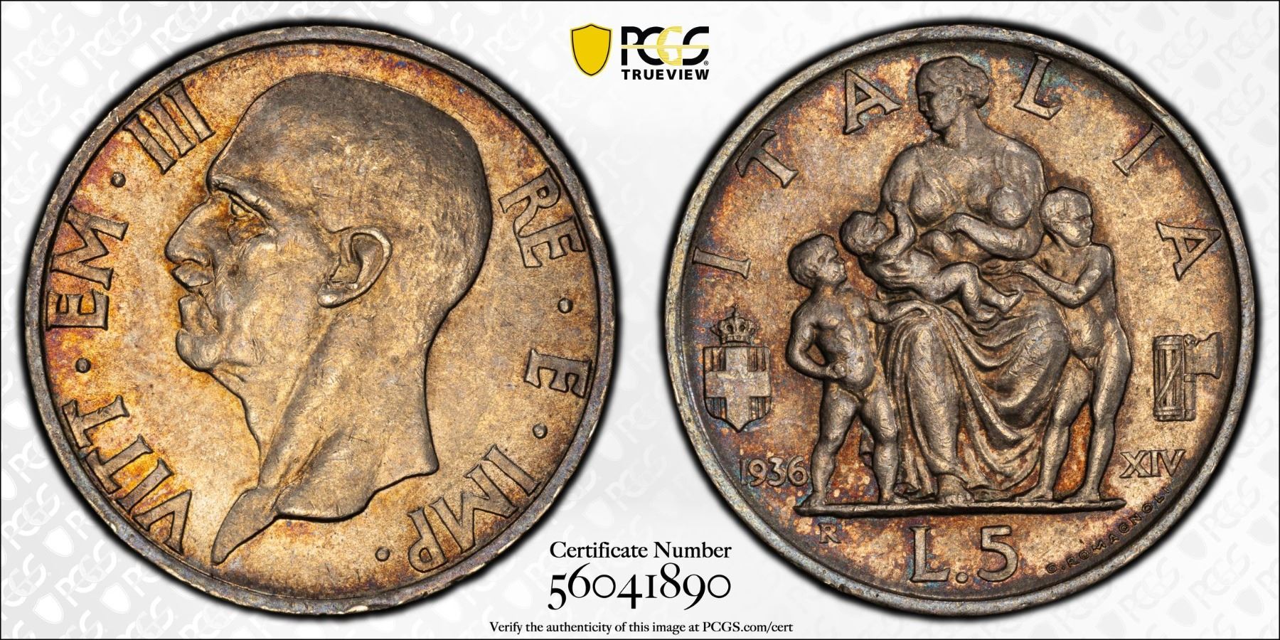 ITALY: Vittorio Emanuele III, 1900-1946, AR 5 lire, 1936-R year XIV, PCGS MS62