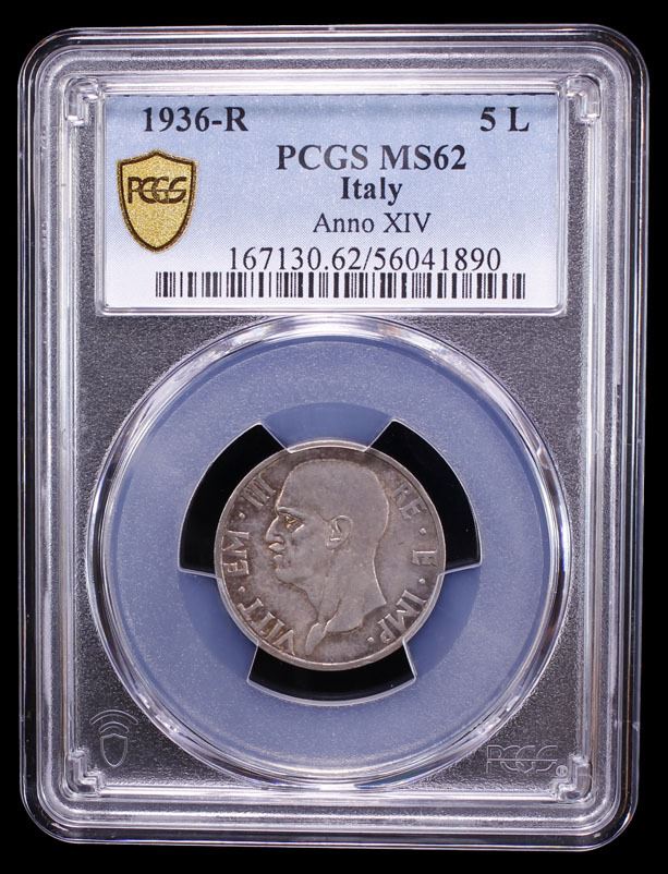 ITALY: Vittorio Emanuele III, 1900-1946, AR 5 lire, 1936-R year XIV, KM-79, N-6670, an attractive example, PCGS graded MS62.