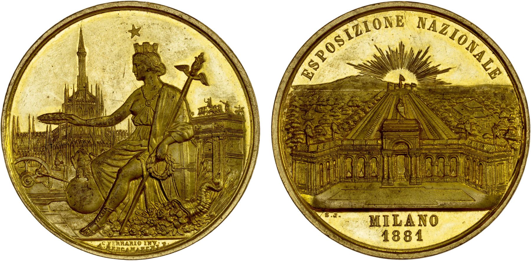 ITALY: gilt AE medal (39.49g), 1881, Wurzbach-5866, 45mm gilt bronze medal by Carlo Ferrario and Stefano Johnson for the Italian Industrial Exhibition in Milan; The turreted allegorical figure of Italy, sitting on the left, with a radiant star above, holds a laurel wreath and a caduceus and leaning onto the shield of Milan, to the ground a cornucopia, in the background the Milan Cathedral and Porta Venezia // ESPOSIZIONE NAZIONALE / MILANO / 1881 with View of the exhibition building, within the park, rising sun in the background, gorgeous proof like luster! Brilliant Unc.