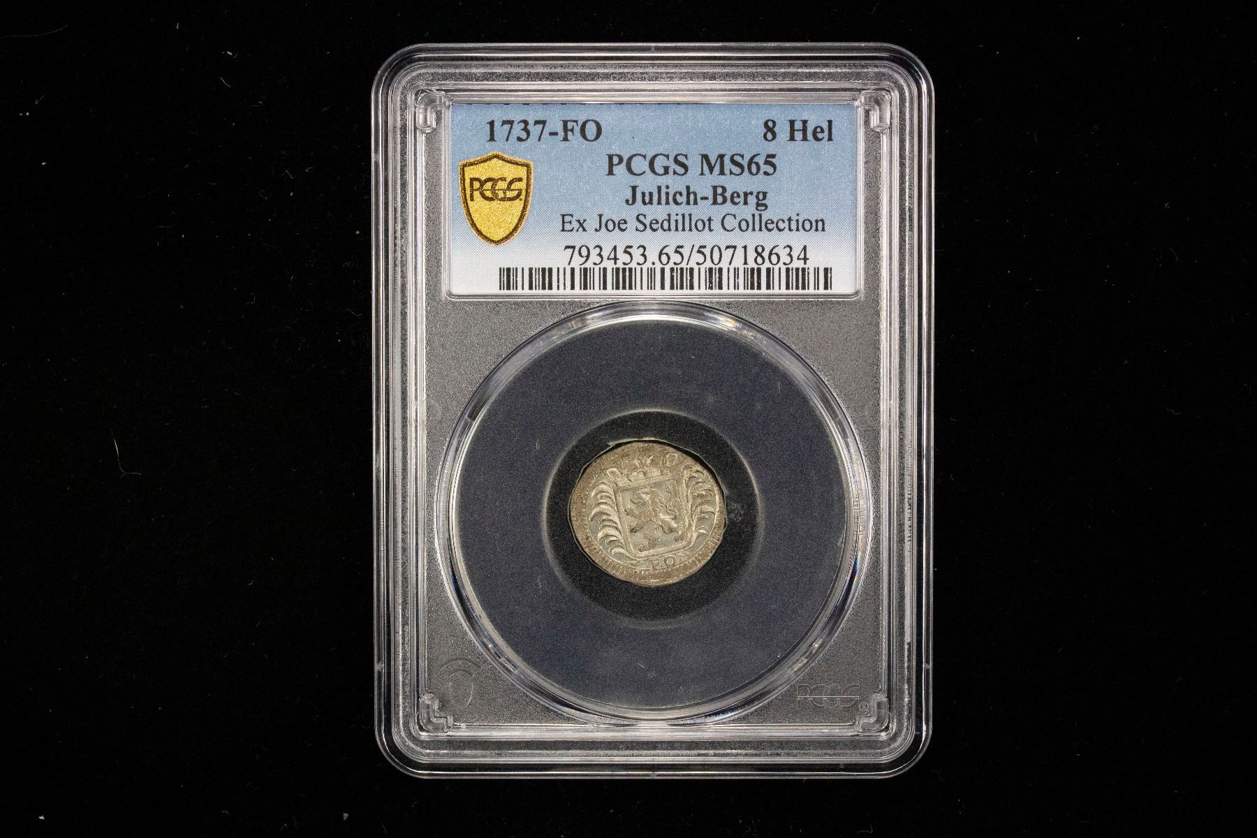 JÜLICH-BERG: Karl Philipp, 1716-1742, BI 8 heller, 1737, KM-186, mint master's initials FO, a superb lustrous mint state example, PCGS graded MS65, ex Joe Sedillot Collection. Finest graded 'top pop' by PCGS!Charles Philip (Karl Philipp) became a cleric in Cologne at the age of fourteen in 1677 in Salzburg, and again in 1679 in Mainz, he was not ordained but instead started a military career in 1684. He then joined the Habsburg war against the Turks 1691-1694 and was promoted to imperial field marshal.