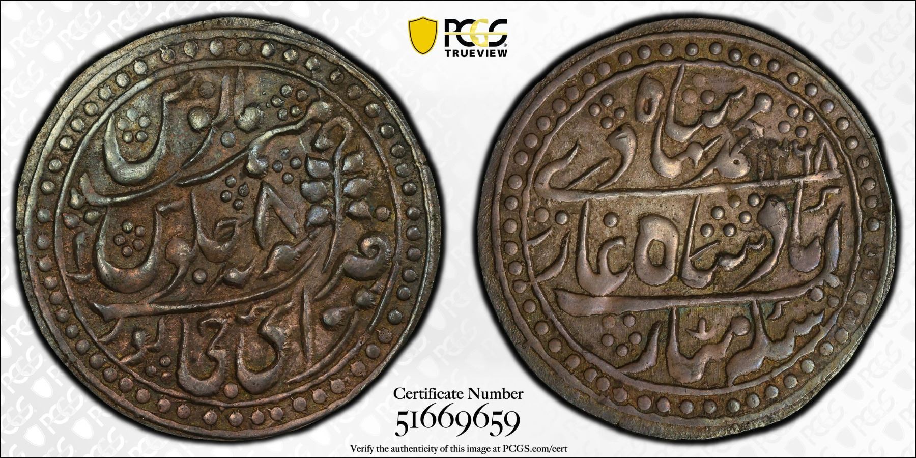 JAIPUR: AR nazarana rupee (11.43g), Sawai Jaipur, AH1268 year 8, KM-95, in name of Bahadur Shah II, an attractive nearly mint state example, PCGS graded AU58.