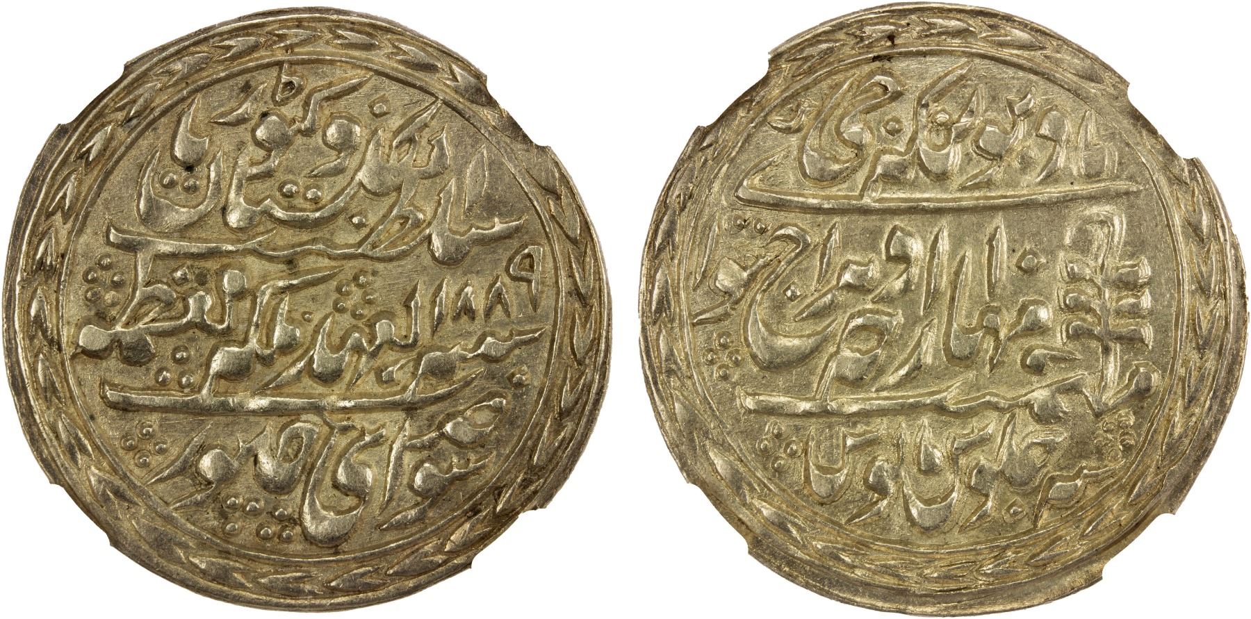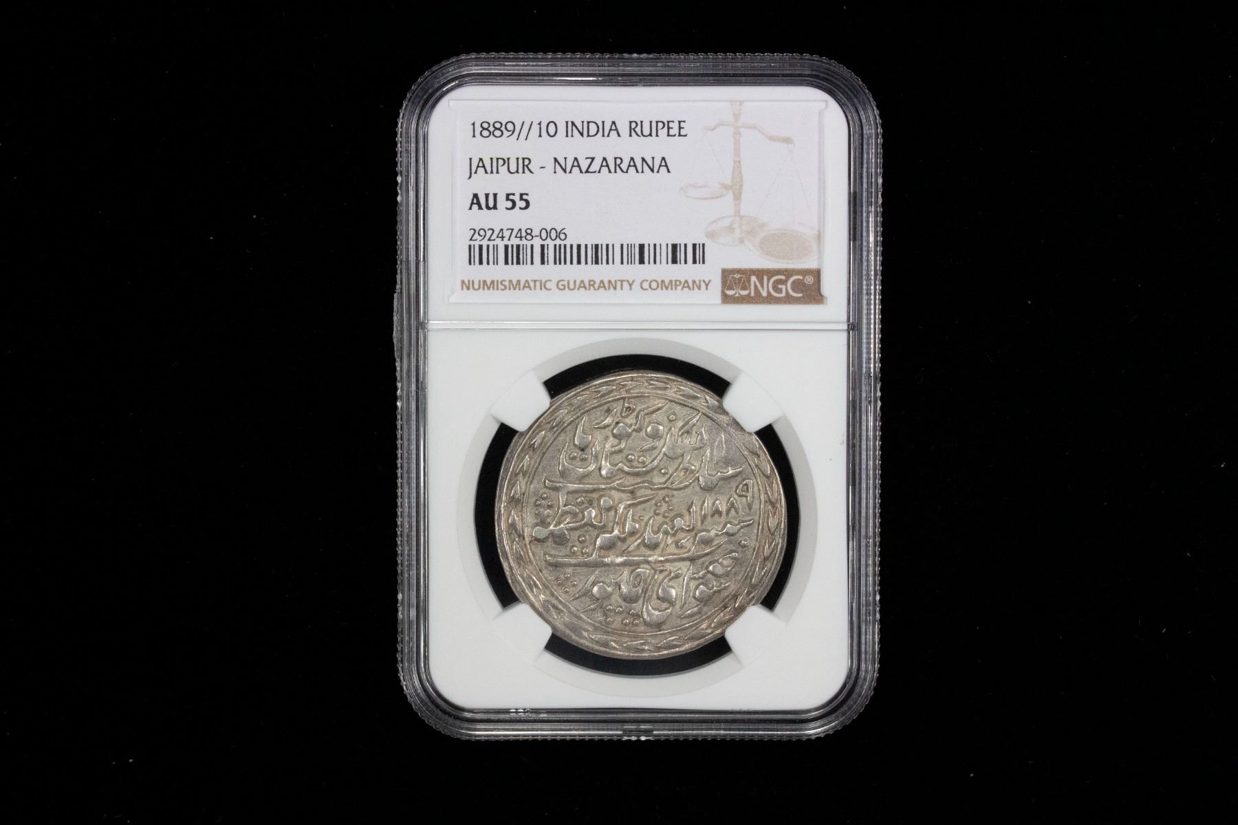 JAIPUR: Madho Rao, 1880-1922, AR nazarana rupee, Sawai Jaipur, 1889 year 10, KM-147, broad flan, superb bold strike, NGC graded AU55, R. Only 1911 & 1913 are common, all other dates rare.