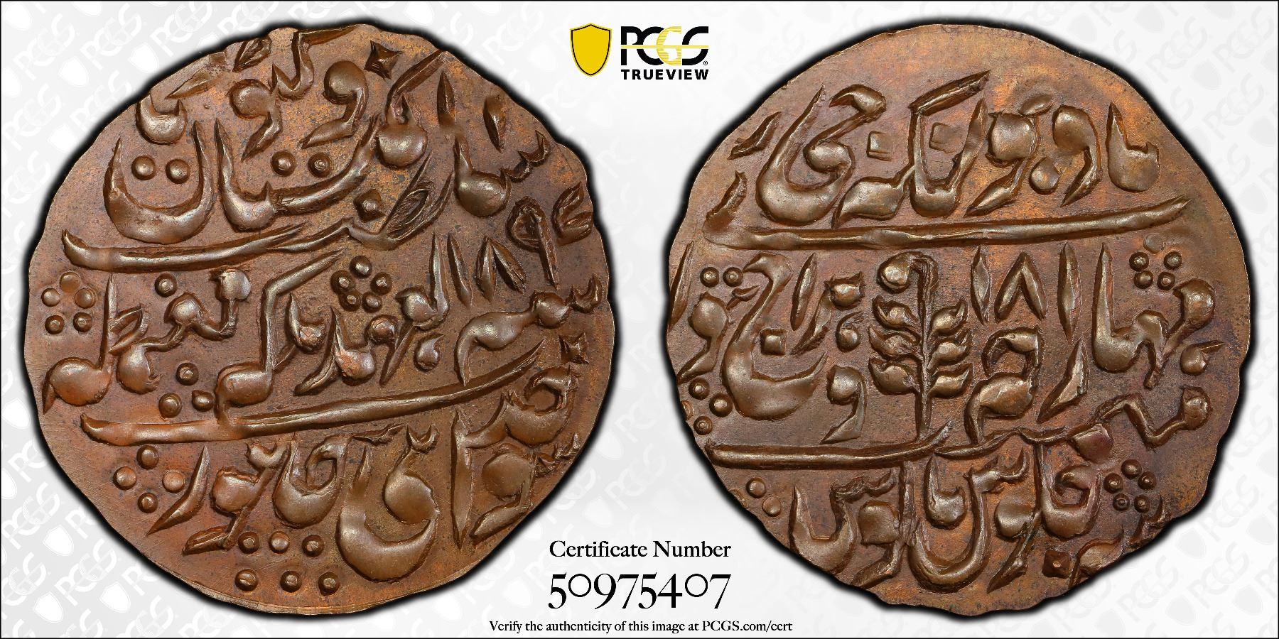 JAIPUR: Madho Singh II, 1880-1922, AE nazarana paisa, Sawai Jaipur, 1897 year 18, KM-132, in the name of Queen Victoria, a lovely mint state example! PCGS graded MS63 BN.