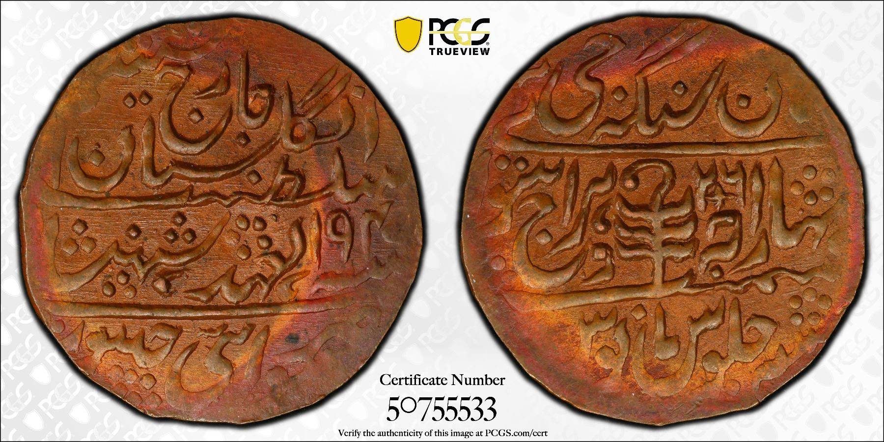 JAIPUR: Man Singh II, 1922–1948, AE nazarana paisa, Sawai Jaipur, 1947 year 26, KM-180, in the name of George VI, a lovely lustrous chocolate brown mint state example! PCGS graded MS63 BN.