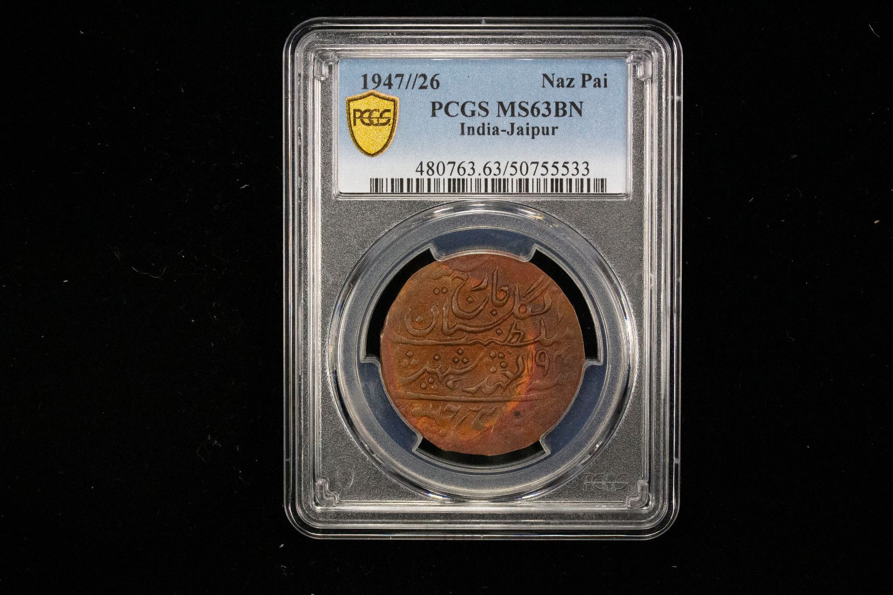 JAIPUR: Man Singh II, 1922–1948, AE nazarana paisa, Sawai Jaipur, 1947 year 26, PCGS MS63 B