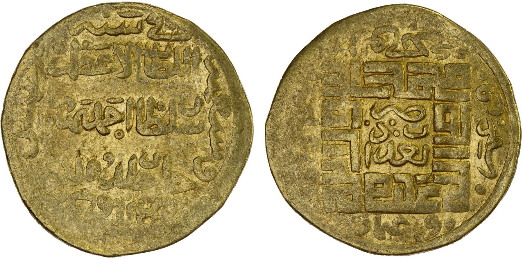 JALAYRID: Sultan Ahmad, 1382-1409, AV dinar (4.59g), Baghdad, AH785, A-2309, royal legends and the date // the kalima, mint name in center, the Rashidun in the margin; appears to be an unpublished date for this type (normally dated AH788), slight weakness near the rims, VF, RR.