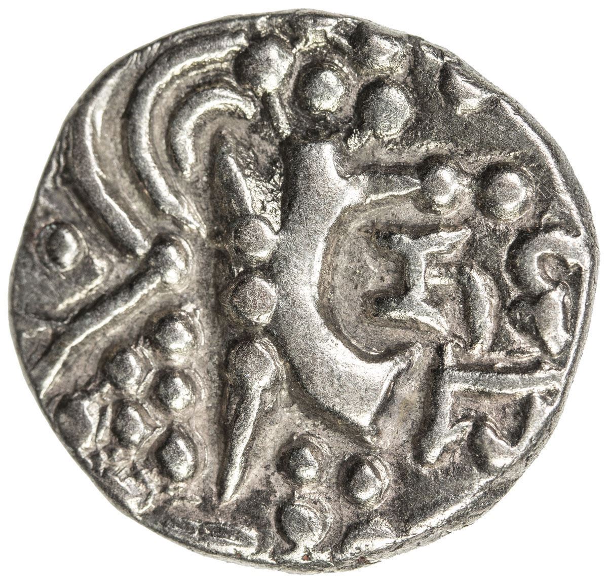 JAMMU & KASHMIR: Namvihakya, 5th century, debased AV stater (7.84g), Mitch-3655, highly stylized late Kushan design (standing king // Ardoksho), unusually attractive bold strike, VF-EF.