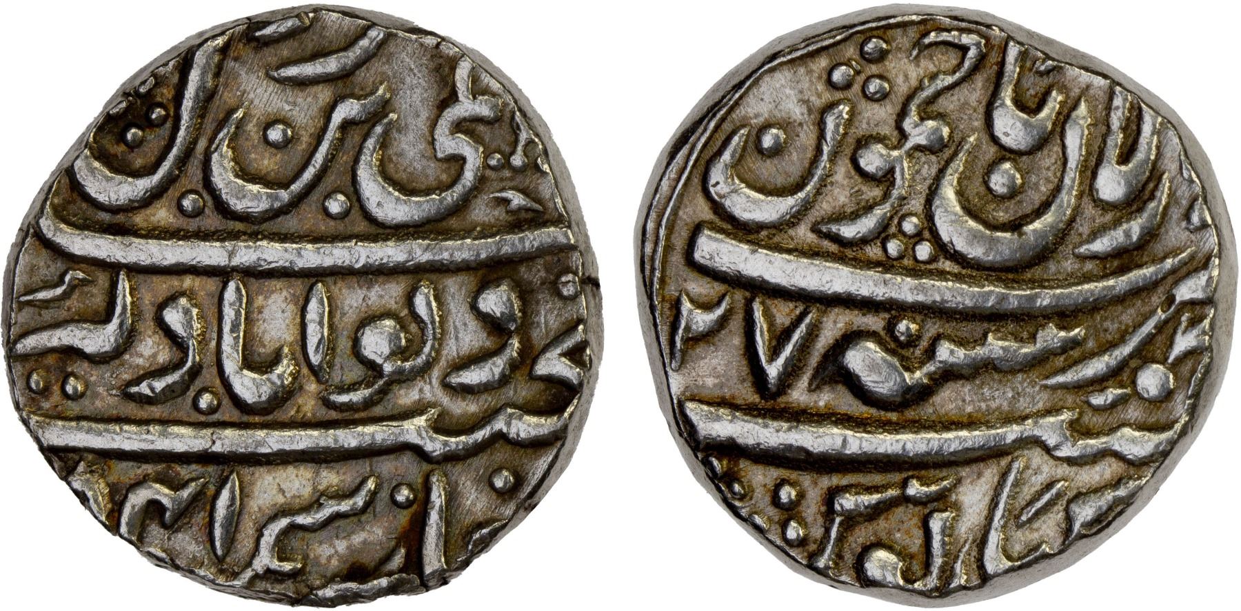 JAMMU: Ranjit Deve, 1742-1780, AR rupee, Dar al-Aman Jammun, VS1841 year 27, KM-10.1, ornate umbrella at upper right corner of obverse; lightly cleaned, bold strike, choice XF.