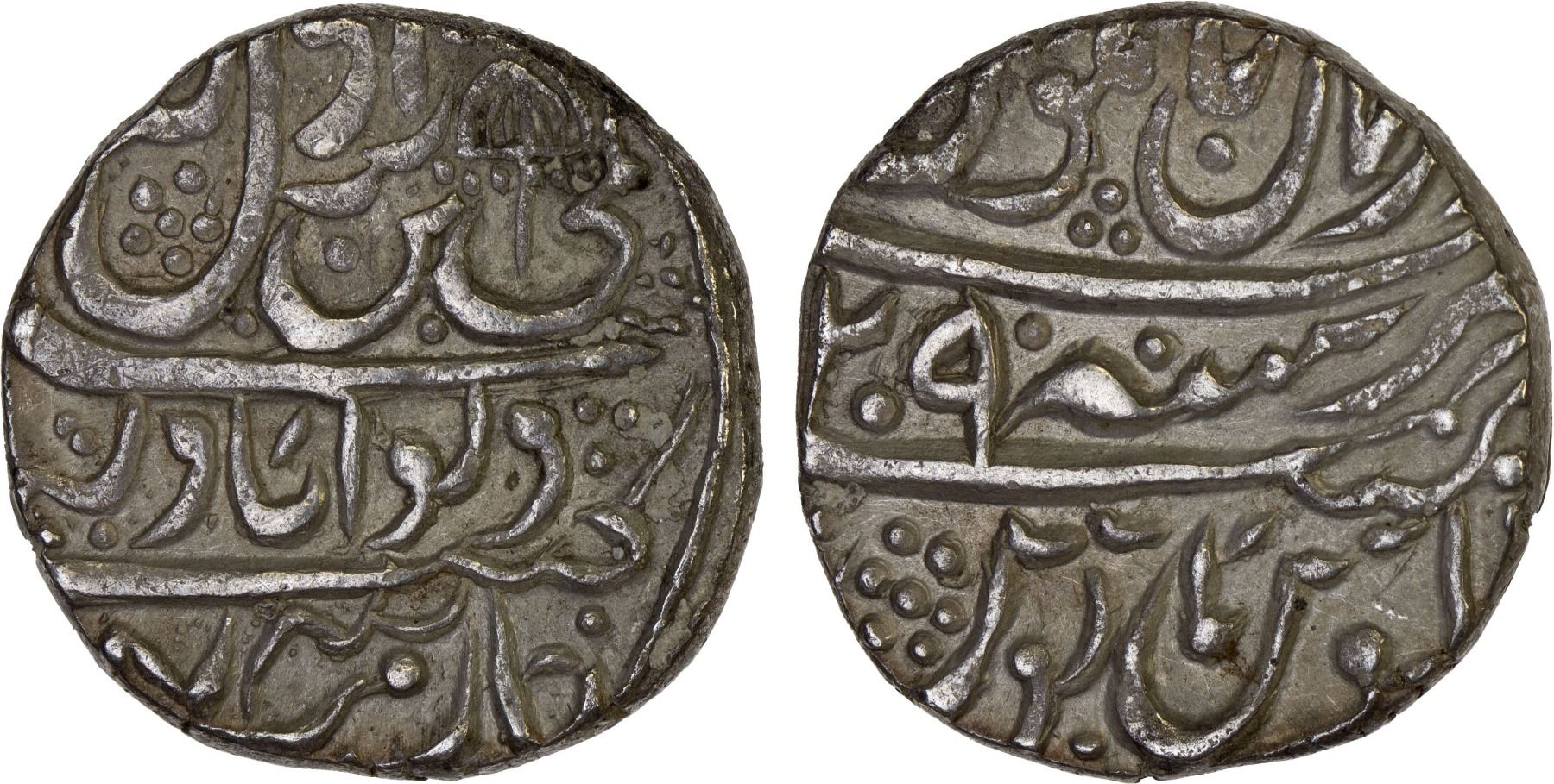 JAMMU: Ranjit Deve, 1742-1780, AR rupee, Dar al-Aman Jammun, VS1841 year 29, KM-10.1, ornate umbrella at upper right corner of obverse; bold strike, AU, ex Paul Stevens Collection.