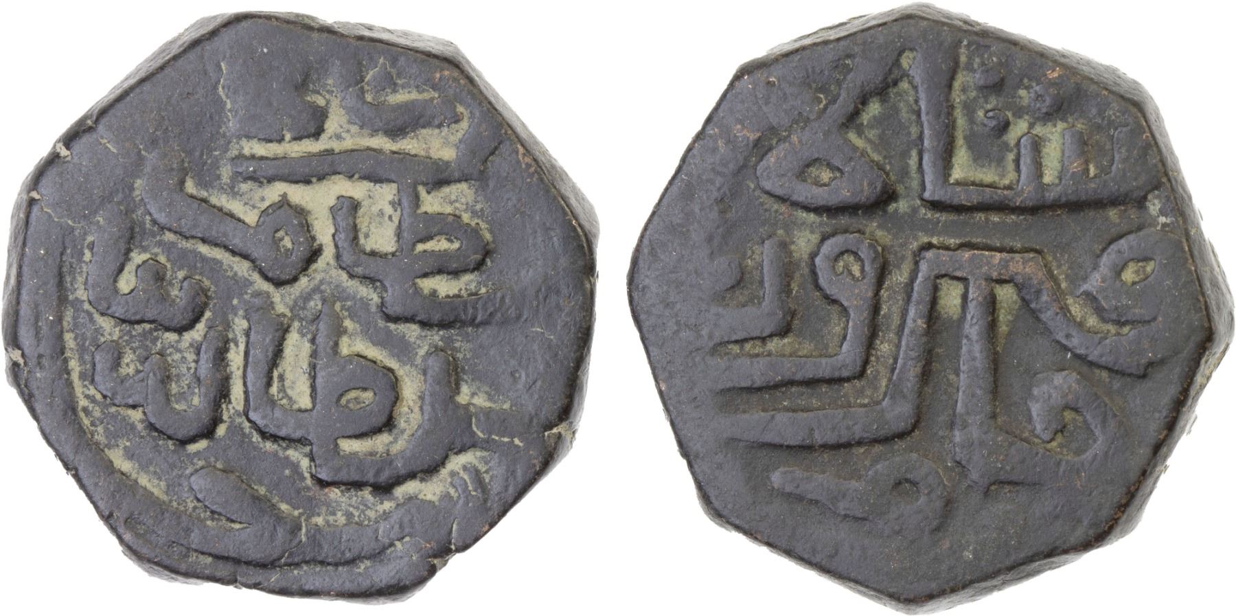 JAMS OF SIND: Jam Firuz Shah, 1508-1523, AE double falus (14.05g), NM, ND, G-, cf. Zeno-252360, citing Jam Firuz Shah on the obverse, his father Nizam Shah Sultan on the reverse, unpublished double falus denomination, VF, RRR. All copper coins of Jam Firuz on CoinArchives, acsearch, and Zeno are single falus in the range of 6.8g to about 8.0g plus one of 11.4g that should be type SJ4.