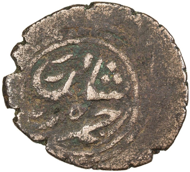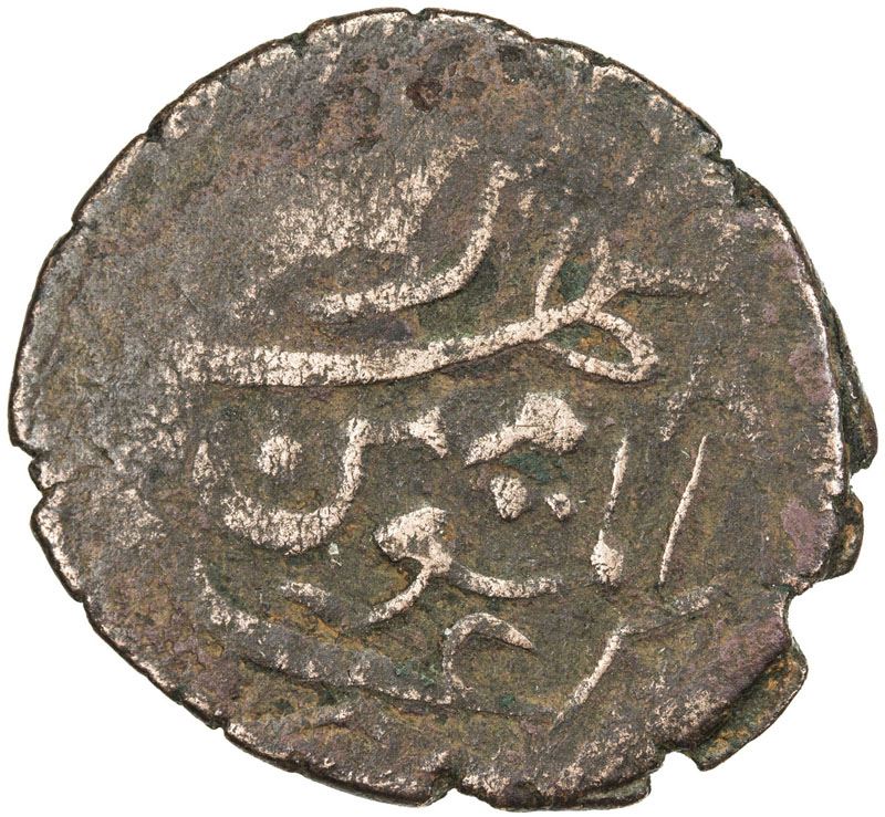 JANID: 'Abd al-Mu'min Khan, 1747-1751, AE tanka (3.39g), NM, ND, A-3024E, obverse text 'abd al-mu'min bahadur, reverse ahmad shah durrani, a reference to the Durrani ruler Ahmad Shah as overlord, Fine to VF, RRRR.    This is first reported example of this type. Only gold tillas were previously reported for this ruler.