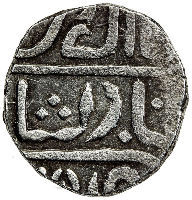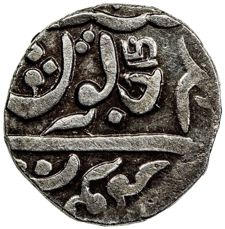 JANJIRA ISLAND: Sidi Ibrahim Khan II, 1803-1825, AR rupee (11.08g), Janjira, ND, KM-—, with an inverted Nagari letter "J" added on the reverse, above the "J" of jalus, VF-EF, RR, ex Paul Stevens Collection. For reference, see the article by Shailendra Bhandare in JONS vol. 178 (winter 2004).