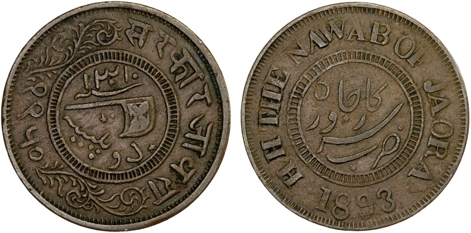 JAORA: Muhammad Isma'il, 1882-1913, AE 2 paise, Sarkar Jaora, 1893/AH1310/VS1950, Choice VF