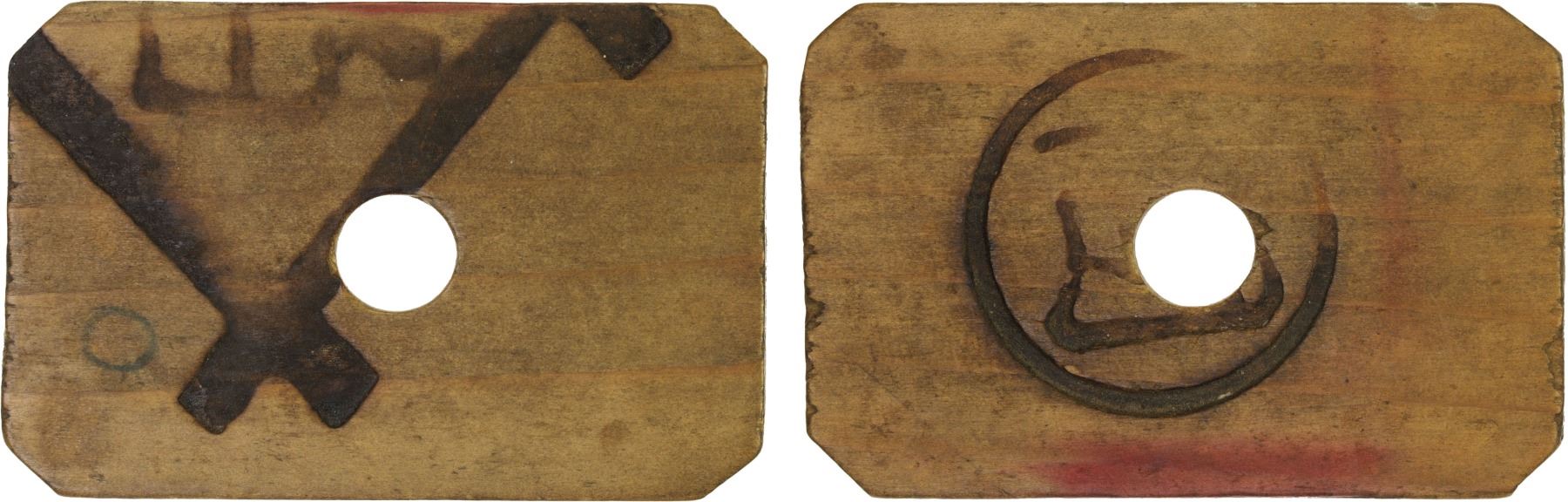 JAPAN: 100 mon token, ink pressed wood token, Echigo-ku Kashiwazaki wholesale bill, shiro (white) // mon (gate), with center hole as made, VF. These wooden tokens of Kashiwazaki City, present-day Murakami City and Uonuma City, was is an area with a rich variety of wooden bills along with the Minamiuonuma area likely produced circa 1850-1870.