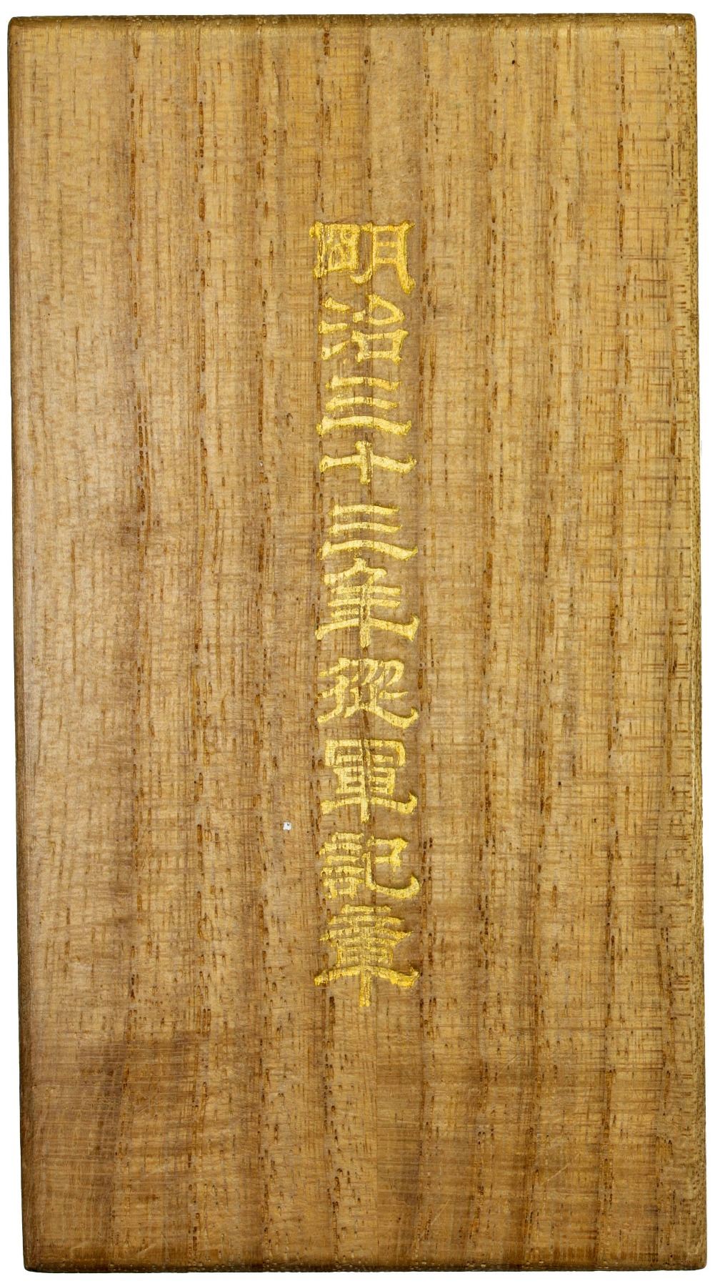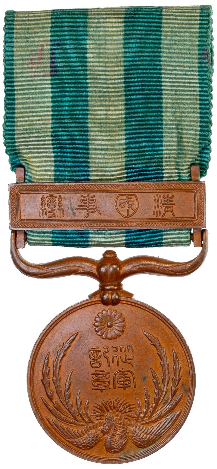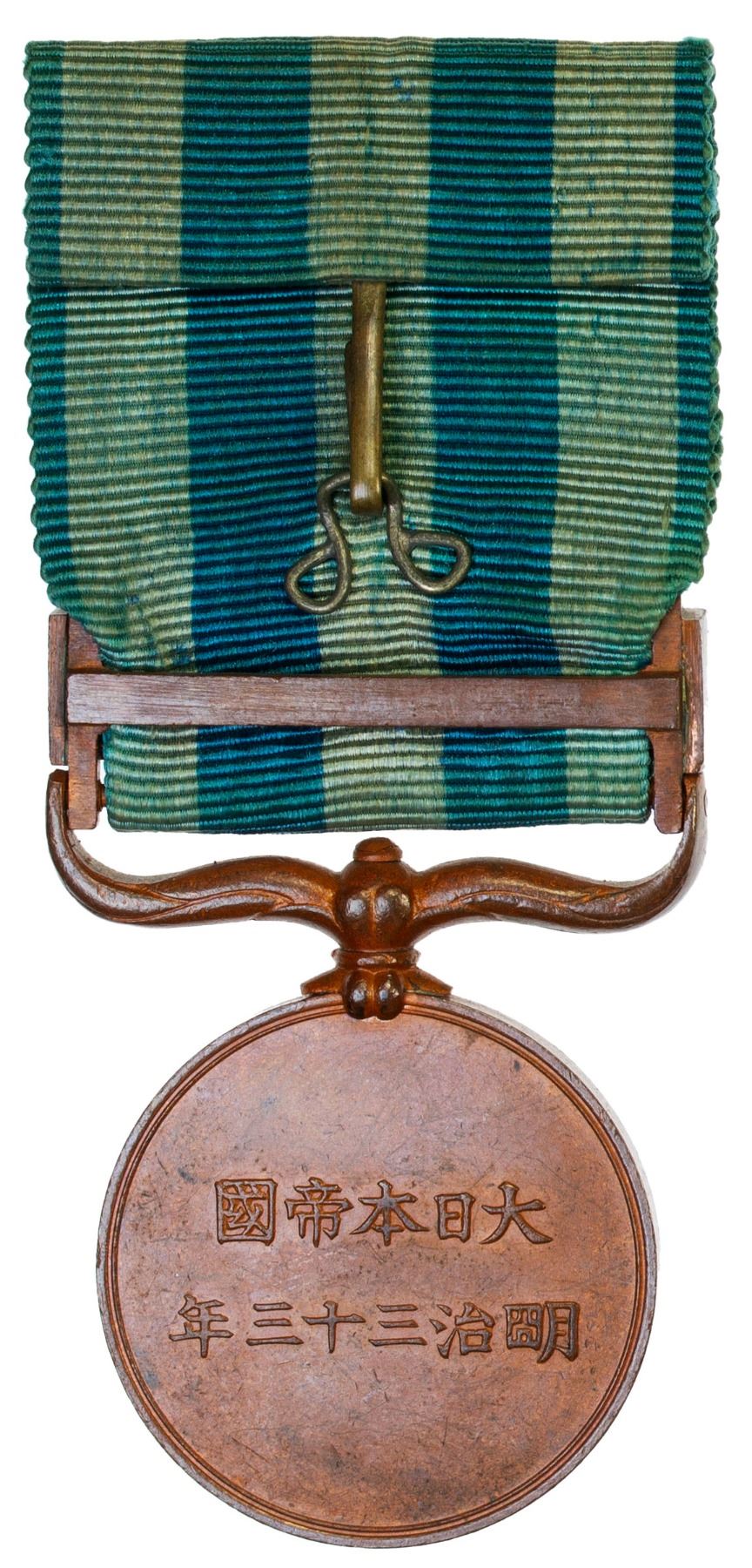 JAPAN: AE medal, The 1900 Boxer War Medal, with original ribbon and paulownia wooden box with gold lettering, AU, ex Joseph E. Lang Collection. The 1900 Japanese Boxer War Medal or the China Relief Expedition Medal (Jugun kisho) was instituted by Imperial Edict No. 142 on April 21, 1901, to honor Japanese forces participating in the Eight-Nation Alliance. It recognized service of Imperial Japanese Army and Navy personnel who participated in the relief of foreign legations in Beijing during the Boxer Rebellion. The obverse features the Imperial chrysanthemum crest and phoenix, with Jugun kisho (War Medal) in Kanji, while the reverse displays "Empire of Great Japan, 33rd year of Meiji" in Kanji.