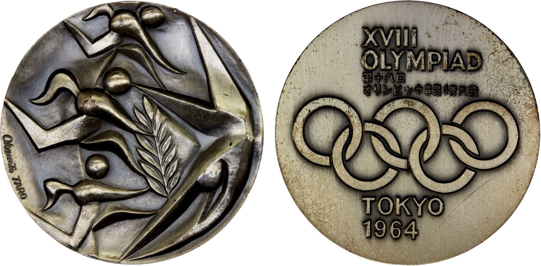 JAPAN: AR medal (33.85g), 1964, van Alfen-107 (AE), 40mm 1.000 fine silver Participant's Medal for the 1964 Summer Olympics by Okamoto Taro and Kazumitsu Tanaka for Naigai Art, Inc., three stylized runners with laurel sprig above and abstract swimmer at top // the Olympic Rings with "XVIII / OLYMPIAD / (Japanese Characters) / (Japanese Characters)" above and "TOKYO / 1964" below, antiqued finish, "FEINSILBER 1000/000" on edge, Unc. This silver version was awarded to Summer Games officials and dignitaries. Participants were awarded the same medal but in bronze and larger (61mm).