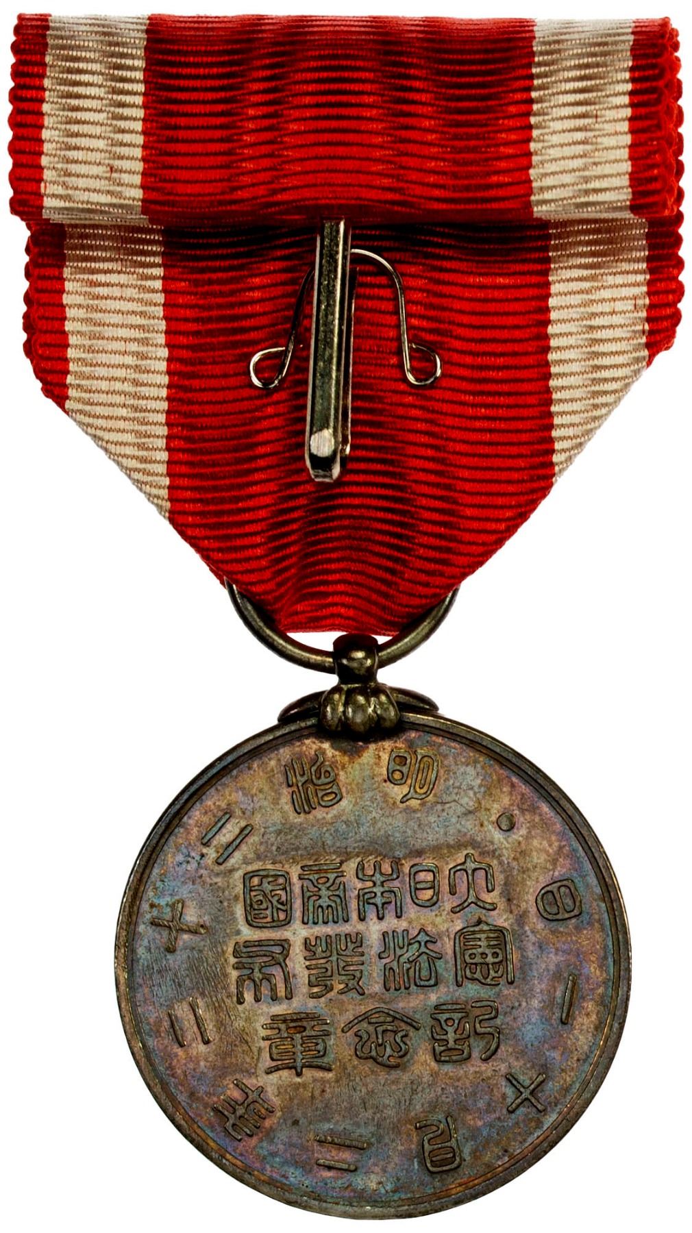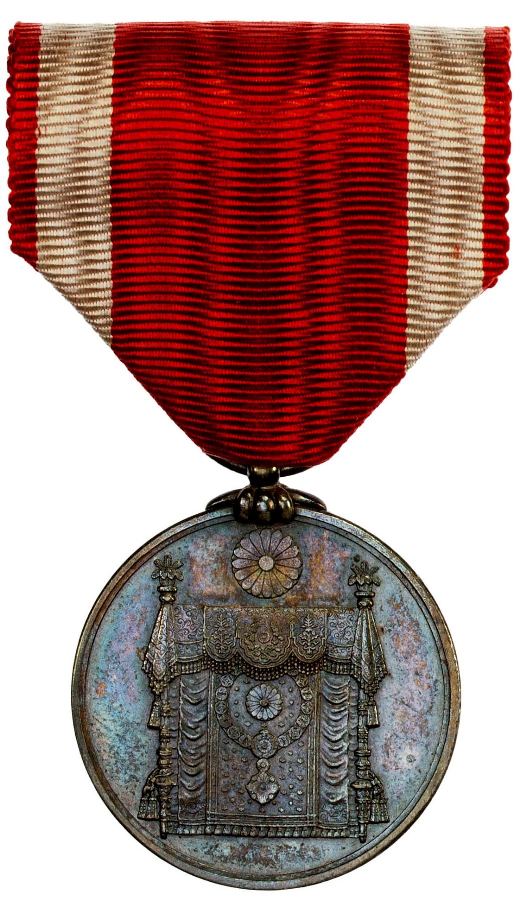 JAPAN: AR medal, The 1889 Commemorative Medal for the Imperial Constitution Promulgation, with original ribbon and paulownia wooden box, AU, ex Joseph E. Lang Collection. The Commemorative Medal for the Imperial Constitution Promulgation was established in 1889 to celebrate the first constitution of Japan, known informally as the Meiji Constitution (Meiji Kenpo), which was proclaimed on February 11, 1889. Enacted after the Meiji Restoration in 1868, it provided for a form of mixed constitutional rule and absolute monarchy, based jointly on the German and British models. The gold medal was awarded to Imperial princes and the silver to people of chokunin or sonin rank. The medal was suspended from a red silk ribbon with white edge stripes, symbolizing the solemnity of the event.