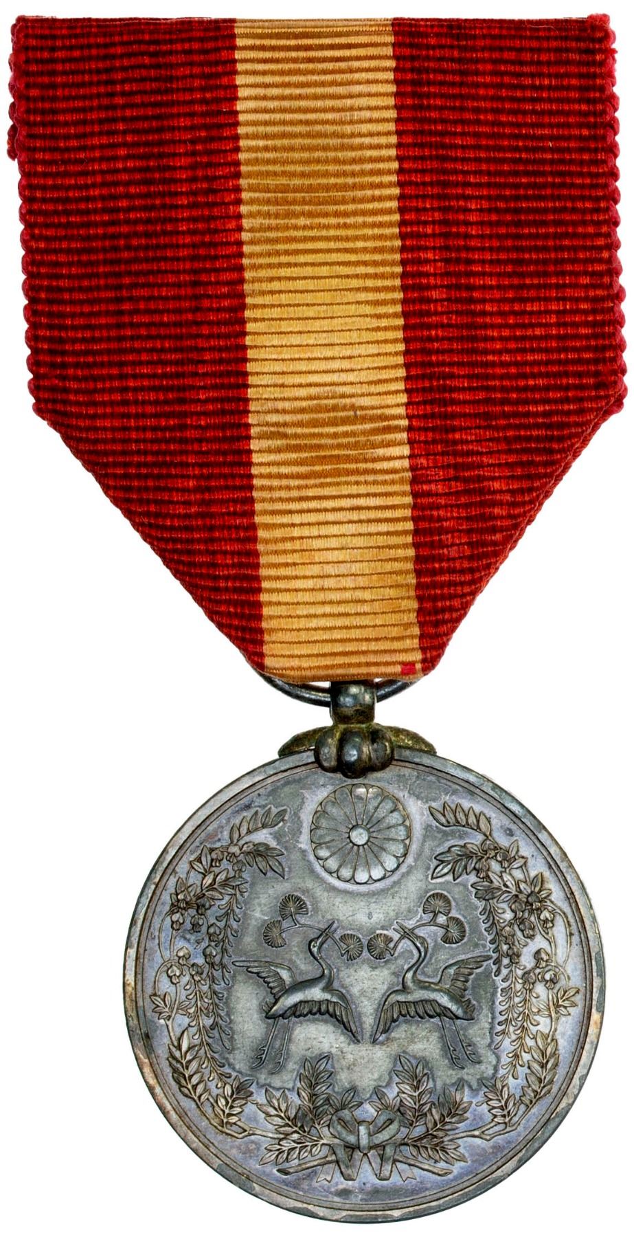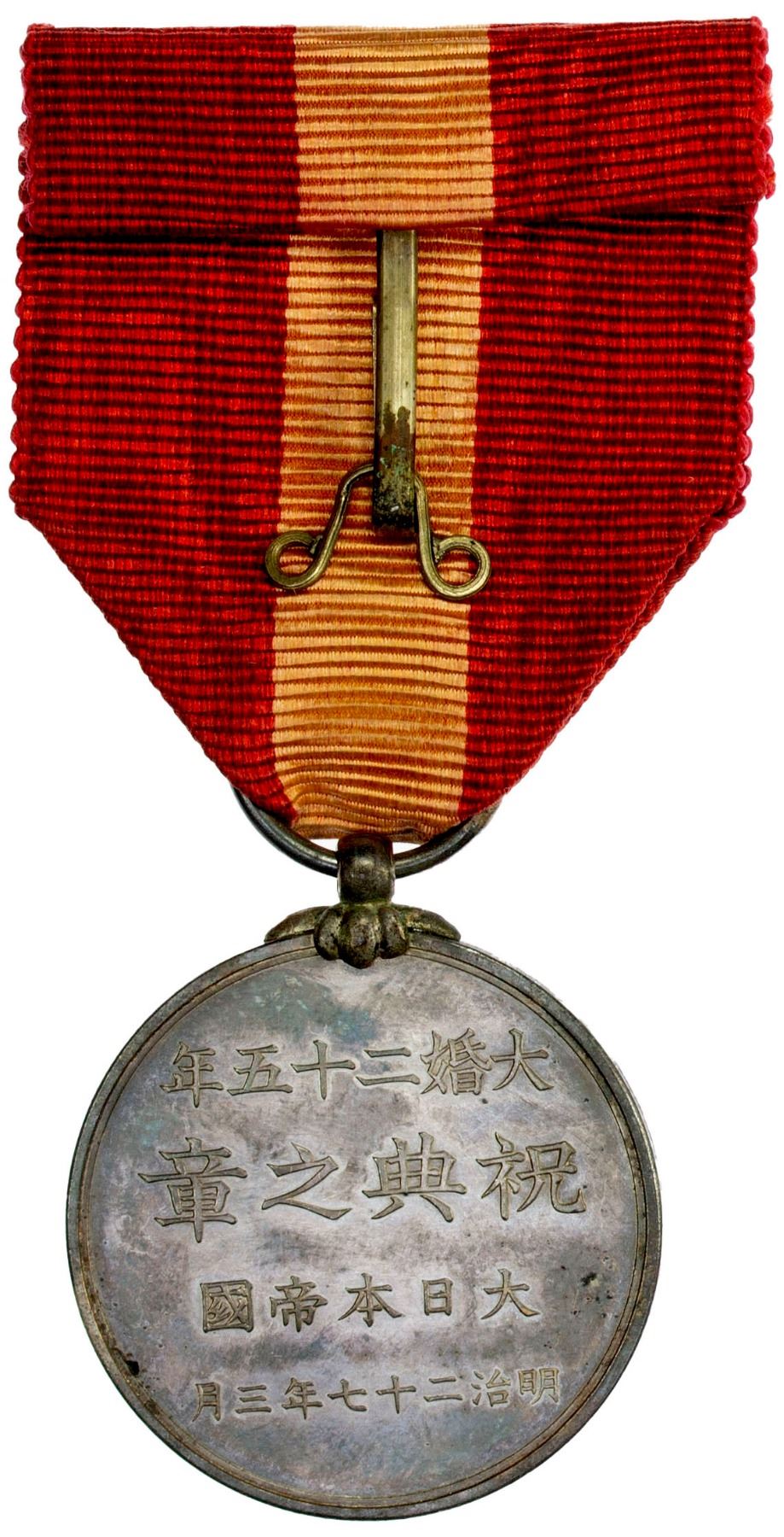 JAPAN: AR medal, Meiji Emperor 25th Wedding Anniversary Commemorative Medal, with original ribbon, AU, RR, ex Joseph E. Lang Collection. The Meiji Emperor 25th Wedding Anniversary Medal was created to commemorate the wedding anniversary of the Meiji Emperor. At the Royal Banquet ceremony held on the day of the official 25th Royal Wedding Anniversary, March 9, 1894, it has been reported that about 100 'Foreign' guests were invited from amongst the Tokyo Diplomatic Community, and were seated at the table of the Meiji Emperor & his wife, comprising 'Heads of Mission' and their wives from 13 countries & accompanied by 57 of their diplomatic staff. The obverse of the medal features two cranes and branches of wisteria and bamboo, which are symbols of good fortune, longevity, health, and fidelity in Japanese culture. The reverse has in four lines, Daikon Nijuugo Shuunen (25th Wedding Anniversary) / Shukuten no Sho (Commemorative Medal) / Dai Nippon Teikoku (Empire of Great Japan) / Meiji Nijuushichi-nen Sangatsu (March, 27th Year of Meiji [1894]). This is the rarest silver issue amongst all 'Commemorative' Japanese medal issues, with only an estimated 1301 silver medals issued.