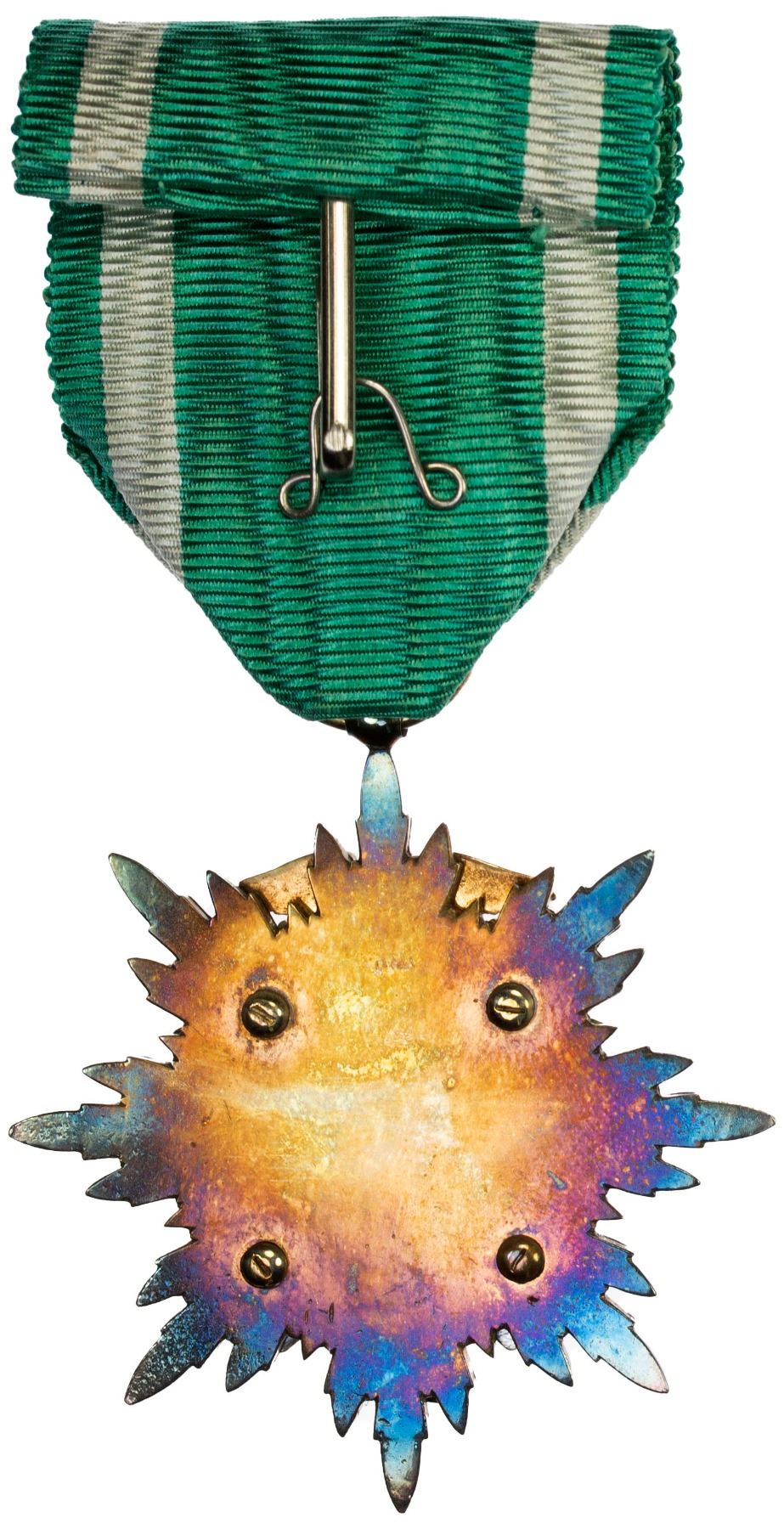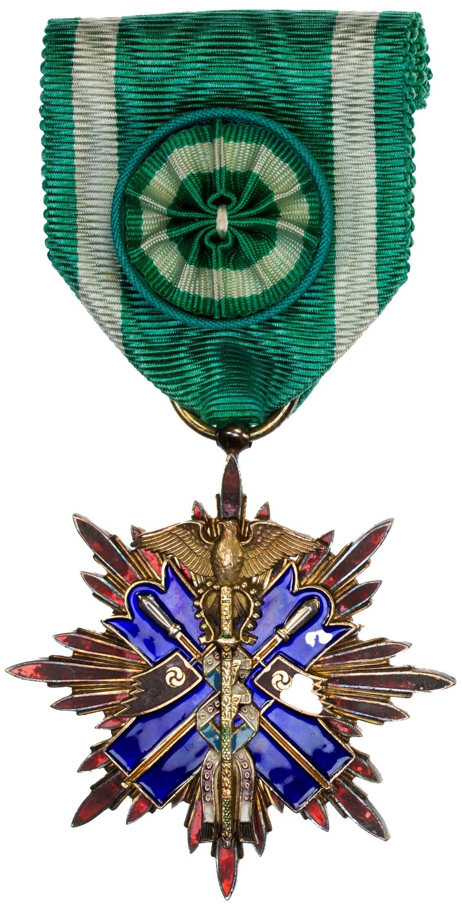 JAPAN: AR medal, Order of the Golden Kite medal, 4th Class, with original ribbon, XF, ex Joseph E. Lang Collection. The Order of the Golden Kite (Kinshi Kunsho) was an order of the Empire of Japan, established on February 12, 1890 by Emperor Meiji "in commemoration of Jimmu Tenno, the Romulus of Japan," It was abolished in 1947 by the Supreme Commander for the Allied Powers (SCAP) during the occupation of Japan, after World War II. The Order of the Golden Kite was an exclusively military award, conferred for bravery, leadership or command in battle. The order consisted of seven classes. The badge depicts a golden kite, a messenger of the kami as described in the ancient Japanese chronicle Nihon Shoki, which helped Emperor Jimmu defeat his enemies in battle. The Nihon Shoki tells of a kinki ("golden kite") that landed on Jimmu's bow and emitted rays of dazzling light that blinded his enemies. The golden kite stands on an eight-pointed star with 32 rays enameled in red. Below the kite are two crossed ancient shields, enameled blue, with two crossed spears with silver heads enameled yellow with red banners, each bearing a mitsudomoe. On one side is a chokuto (enameled green with white trappings).