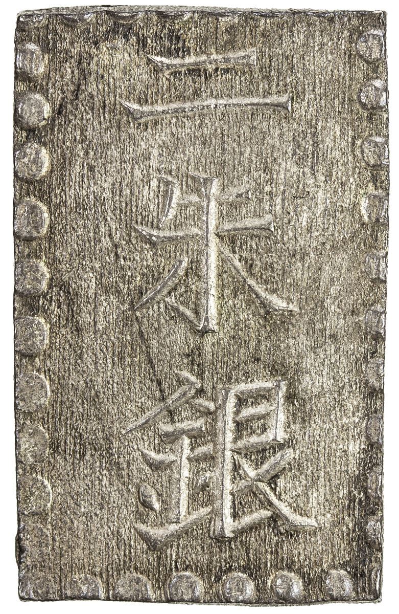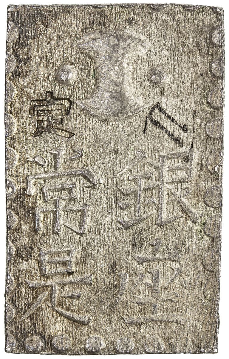 JAPAN: Ansei, 1854-1860, AR 2 shu (13.71g), H-9.88, JNDA-09-56, ni shu gin // ginza (silver mint) joze (mint official) with fundo (weight) above, stamped with single character jo (guaranteed) incuse, struck only in 1859, VF to EF, RR, ex Dr. Axel Wahlstedt Collection.