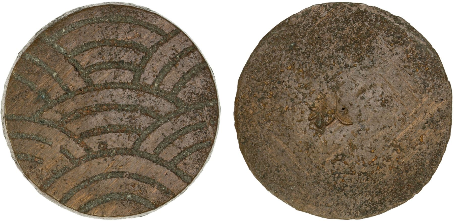 JAPAN: Bunkyu, 1861-1864, AE 100 mon (41.01g), Akita mint, Dewa Province, H-7.1, JNDA-139.12, Akita Nami Sen (Akita wave coin), twenty-one waves // incuse akita stamped below, usual mint adjustment marks, VF. Although originally valued at 100 mon, their lack of popularity eventually depreciated the value. The wave design shares the same design as the common Kanei Tsuho cash coins with the waves at the back. These were cast with copper from the Aniyama Mine.