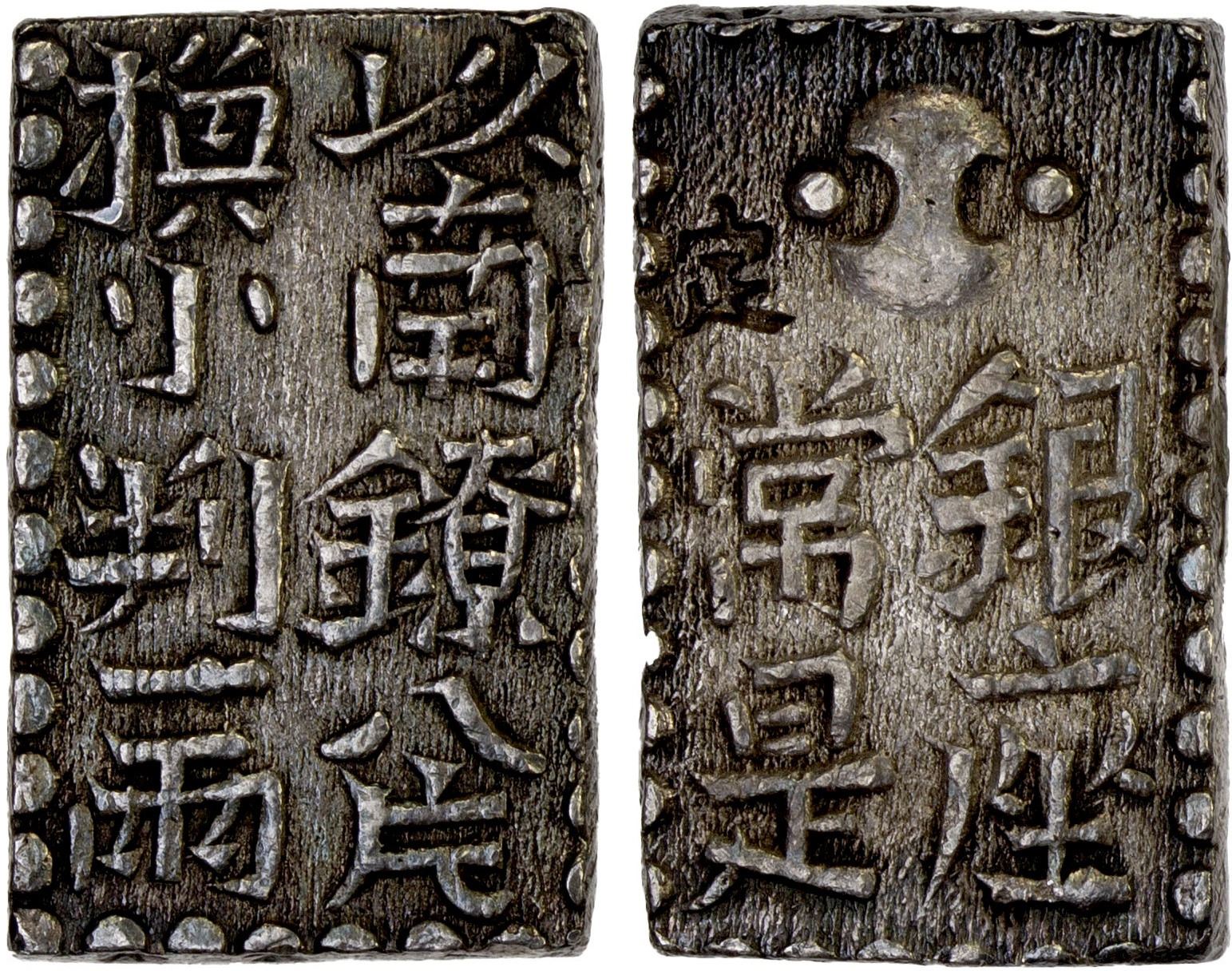 JAPAN: Bunsei, 1818-1830, AR 2 bu (7.46g), Edo mint, H-9.75, JNDA-09-48, Shin Nanryo type ni shu gin, Japanese Kanji for "take eight pieces Nanryo to exchange for one ryo koban" // a Fundo (weight), stamped with single incuse character jo (guaranteed) above ginza (silver mint) and joze (mint official) all surrounded by pearl border, issued 1824-30, XF.