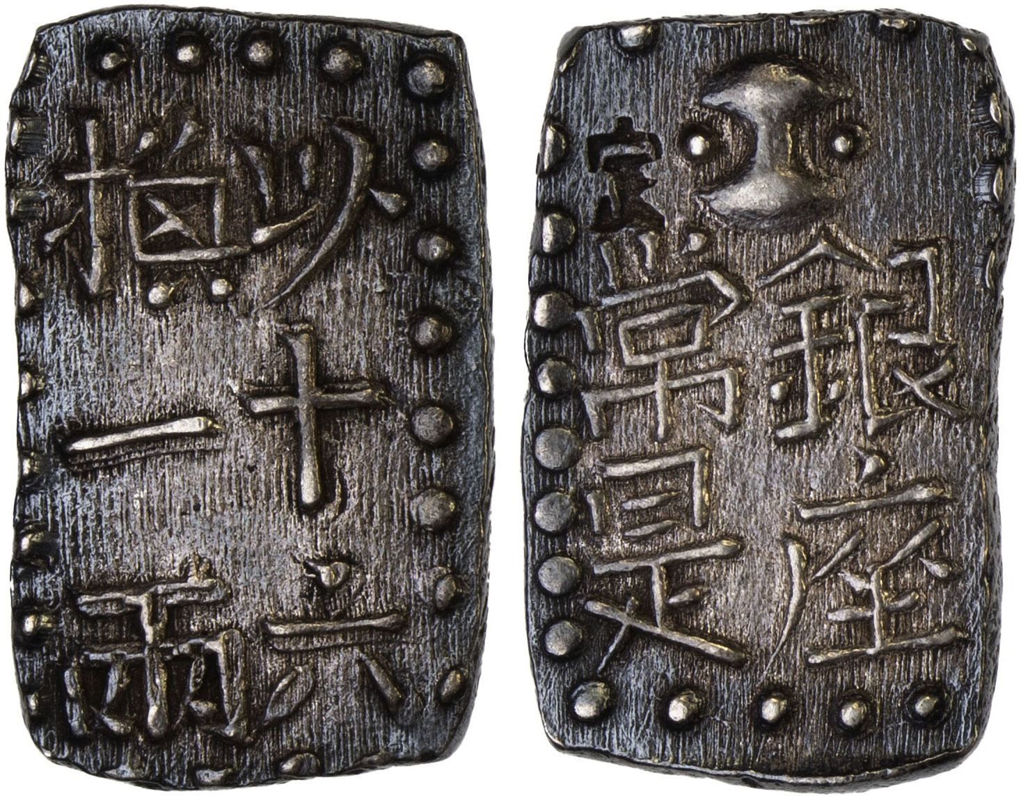 JAPAN: Bunsei, 1818-1830, AR 2 shu (2.62g), Edo mint, H-9.76, JNDA-09-49, Nanryo isshu gin type, Japanese Kanji for "take sixteen pieces Nanryo to exchange for one ryo" // a Fundo (symbol for official weight with an incuse stamp, jo, to the left of it over ginza (silver mint) and joze (mint official) all surrounded by pearl border, issued 1829-37, XF.