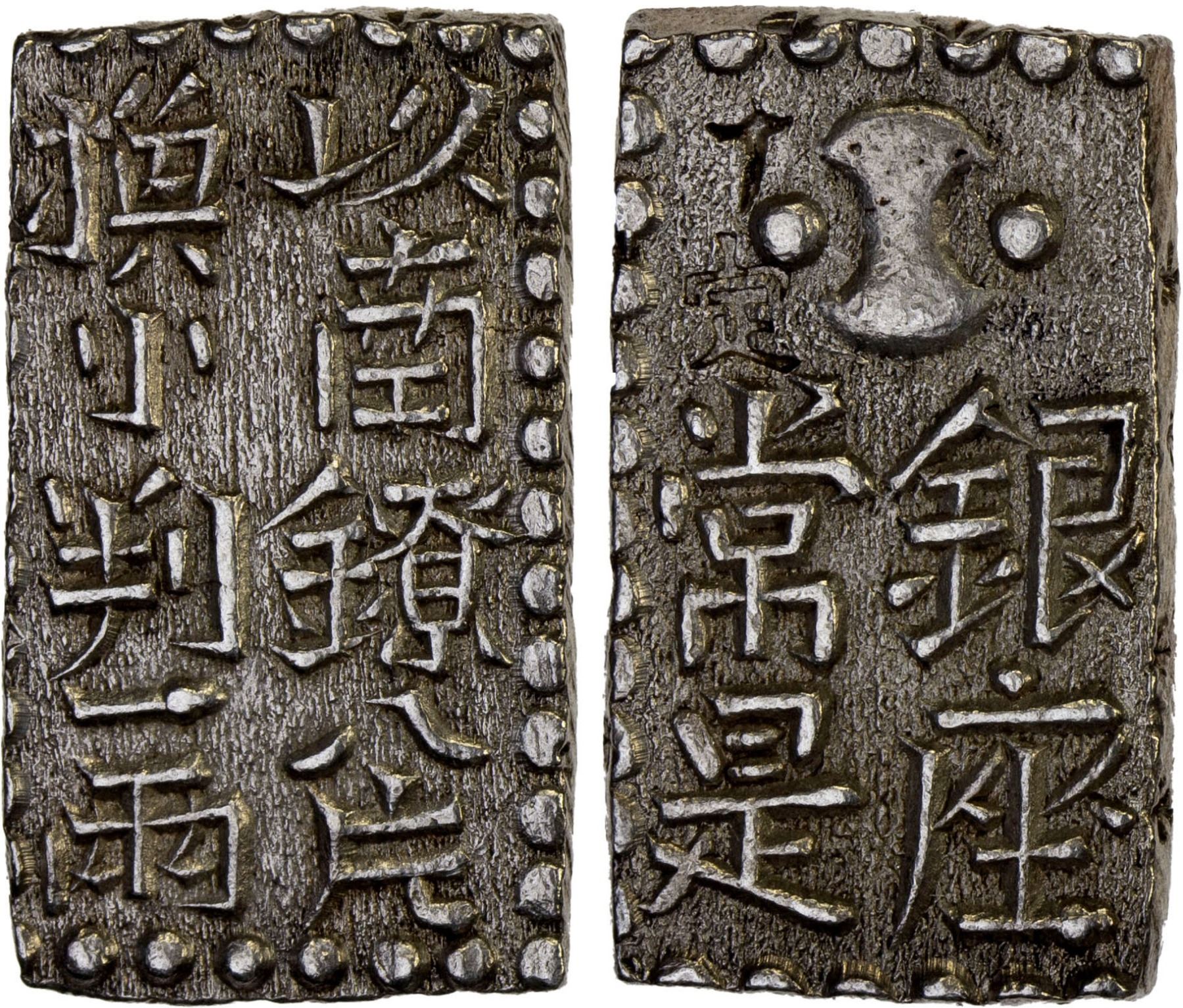 JAPAN: Bunsei, 1818-1830, AR 2 shu (7.49g), Edo mint, H-9.75, JNDA-09-48, Sin Nanryo type, ni shu gin, Japanese Kanji for "take eight pieces Nanryo to exchange for one ryo koban" // a Fundo (weight), stamped with single incuse character jo (guaranteed) above ginza (silver mint) and joze (mint official) all surrounded by pearl border, issued 1824-30, XF.