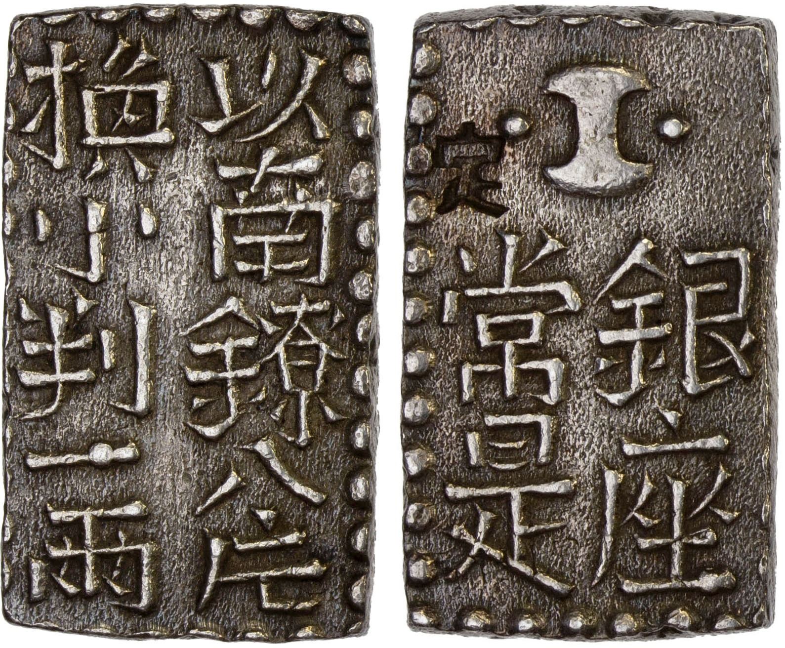JAPAN: Bunsei, 1818-1830, AR 2 shu (7.75g), Edo mint, H-9.75, JNDA-09-48, Shin Nanryo type ni shu gin, Japanese Kanji for "take eight pieces Nanryo to exchange for one ryo koban" // a Fundo (weight), stamped with single incuse character jo (guaranteed) above ginza (silver mint) and joze (mint official) all surrounded by pearl border, in .978 fine silver, issued 1824-30, XF.