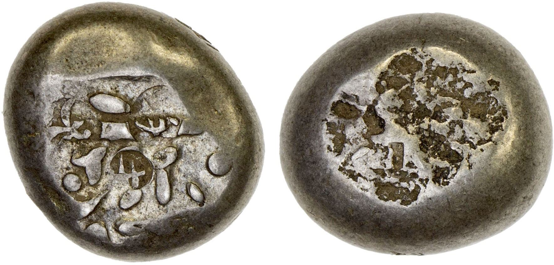 JAPAN: Bunsei, 1818-1830, AR mameita-gin (5.11g), H-9.46e, JNDA-09-67, so-called "bean money", with mint official name joze eft of Daikoku, the God of Wealth, with character bun within and many small characters bun in the fields, most of design off flan as usual for type, in .460 fine silver, struck 1820-37, with merchant chopmarks, VF. The Japanese "mameita-gin," also known as "bean money," is made from silver alloys using the "yudoko-buki" method: molten metal is poured into a cloth (such as linen) submerged in hot water. The designs were hammered into the cooling silver. "Mameita gin" were produced from around 1620 until the 1850s. The weight of the produced coins varied considerably, and they were used more like bullion rather than units of account.