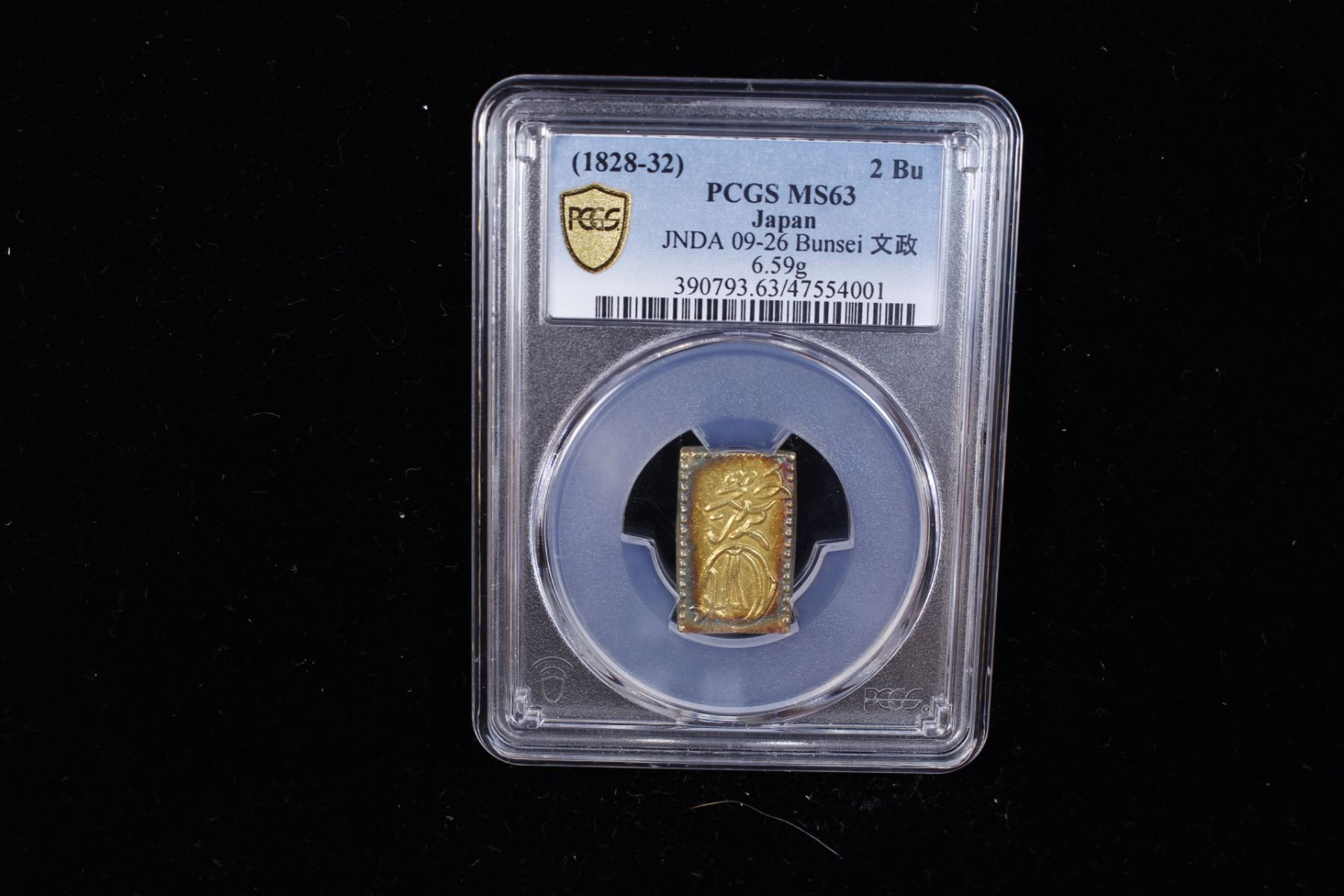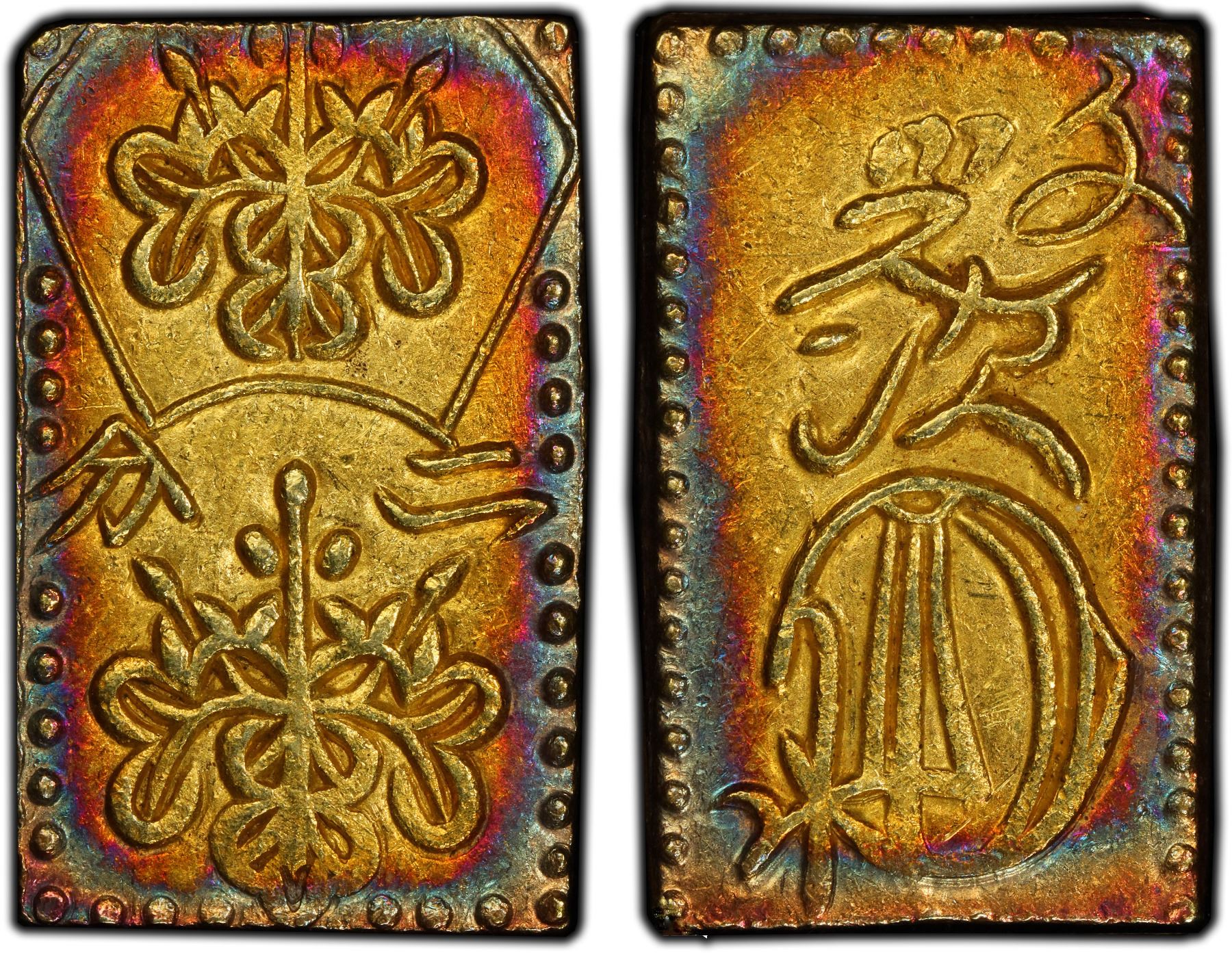JAPAN: Bunsei, 1818-1830, AV 2 bu (ni bu) (6.59g), ND (1828-32), Cr-21a. Fr-19, JNDA-09-26, struck in 0.490 fine gold and 0.510 fine silver, very nice peripheral toning, PCGS graded MS63.