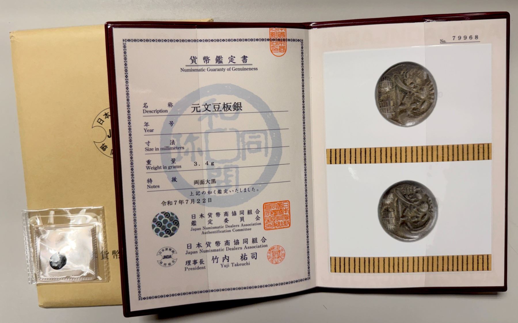 JAPAN: Genbun, 1736-1741, AR mameita-gin (3.40g), H-9.42, JNDA-09-66, so-called "bean money", Daikoku, the God of Wealth, on both sides with character bun within, struck 1736-1818, XF-AU.