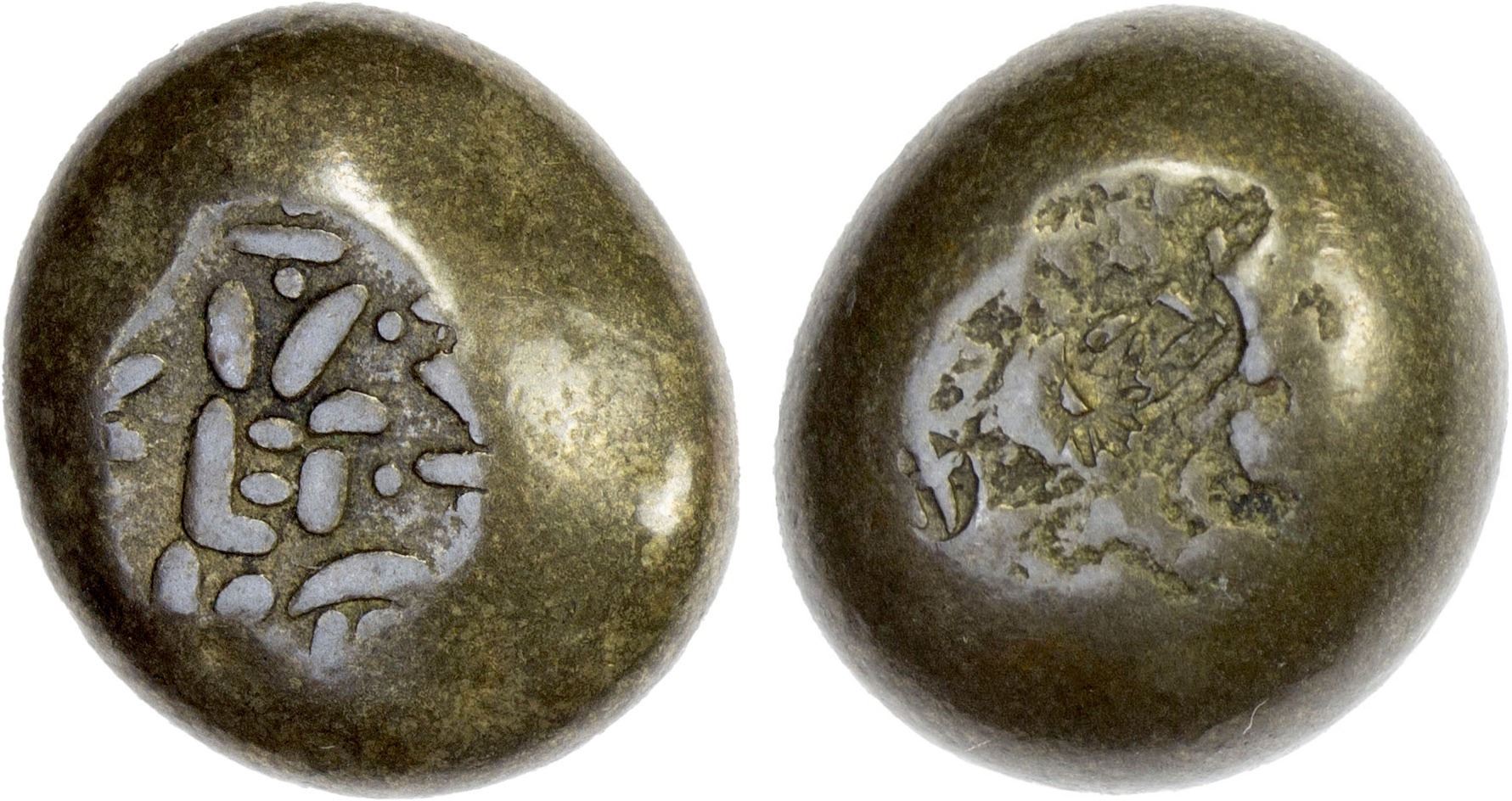 JAPAN: Genbun, 1736-1741, AR mameita-gin (8.81g), H-9.40d, JNDA-09-66, so-called "bean money", with character ho (treasure), mint official name joze, and many small characters bun in the fields, most of design off flan as usual for type, in .460 fine silver, struck 1736-1818, VF. The Japanese "mameita-gin," also known as "bean money," is made from silver alloys using the "yudoko-buki" method: molten metal is poured into a cloth (such as linen) submerged in hot water. The designs were hammered into the cooling silver. "Mameita gin" were produced from around 1620 until the 1850s. The weight of the produced coins varied considerably, and they were used more like bullion rather than units of account.