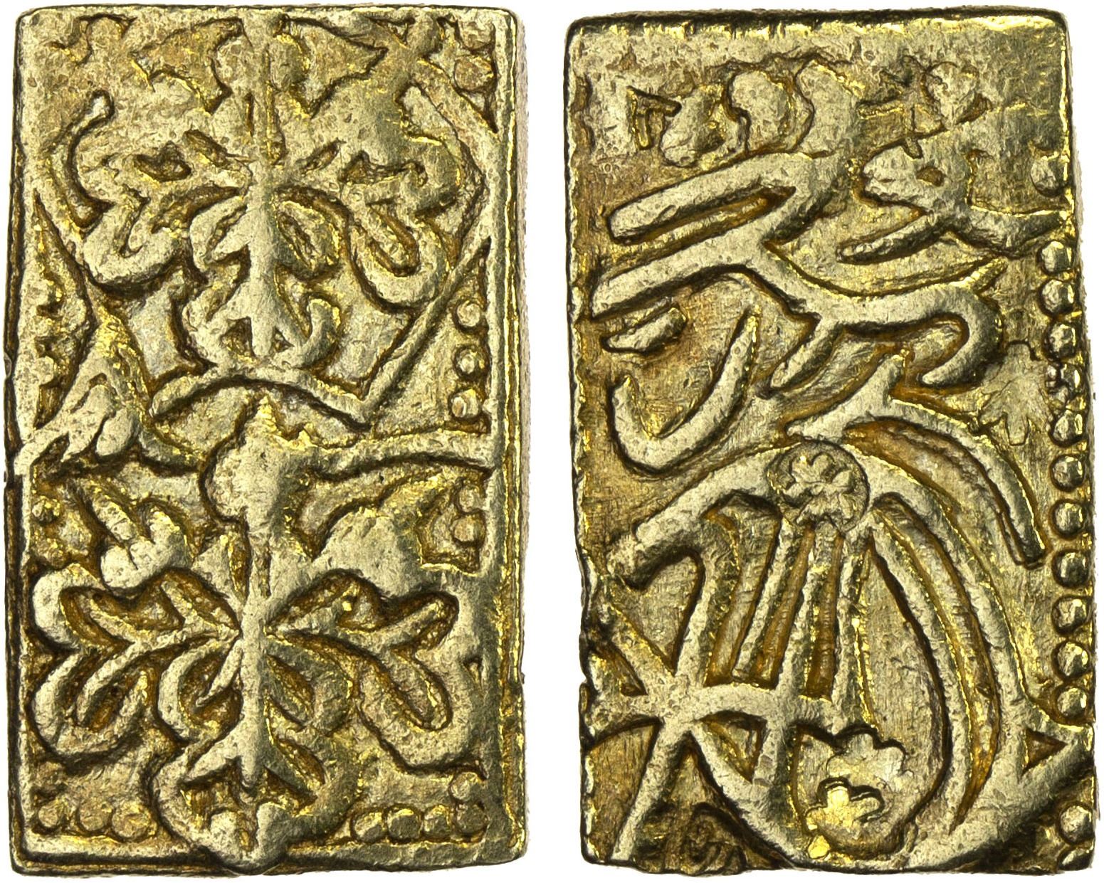 JAPAN: Genbun, 1736-1741, AV bu (3.26g), Edo Mint, H-8.42, JNDA-09-37, struck 1819-28, fan-shaped kiri crest above and below, ichi bu at center // Mitsutsugu signature, bun in standard script at upper right, four small banker's marks on reverse, one more each on left and right edge, lightly polished, VF.