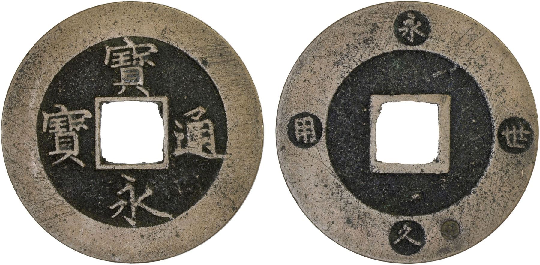 In the 5th year of Hoei (1708) the Hoeitsuho coin was cast at the Shichijo mint. This type was often called "ozeni" due to its large size. The people found it inconvenient to use, although they were informed that they would be punished for not using it. This was hardly surprising as the government issued the coin with a nominal value of ten mon, but its intrinsic value was only about three mon. This example came from a small group of higher than average quality examples, boldly cast with clear reverse incuse characters.
