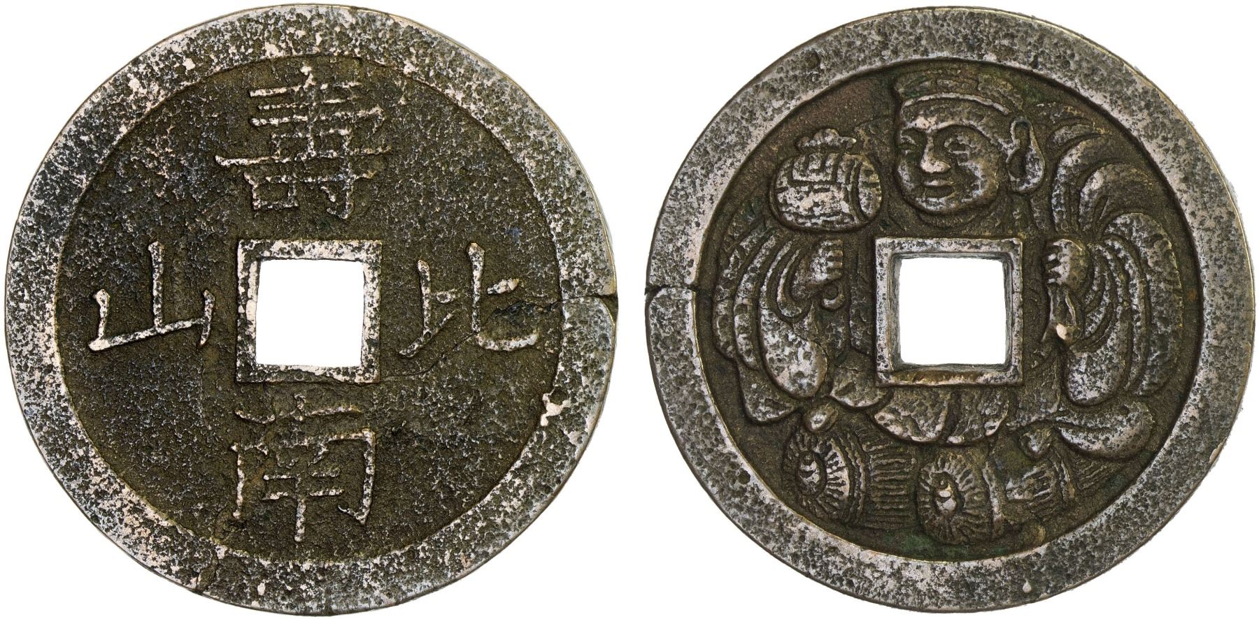 JAPAN: Keio, 1865-1868, AE 25 mon (7.19g), H-7.5, known as a Mito Daikoku-sen with Daikoku, the God of Wealth on reverse, kotobuki-hi nanzan ("Longevity as great as the South Mountain"), cast in bronze, faint casting crack, Choice VF. These coins were first issued in 1864 by the Morioka-han in Mutsu Province (present day Iwate-ken).