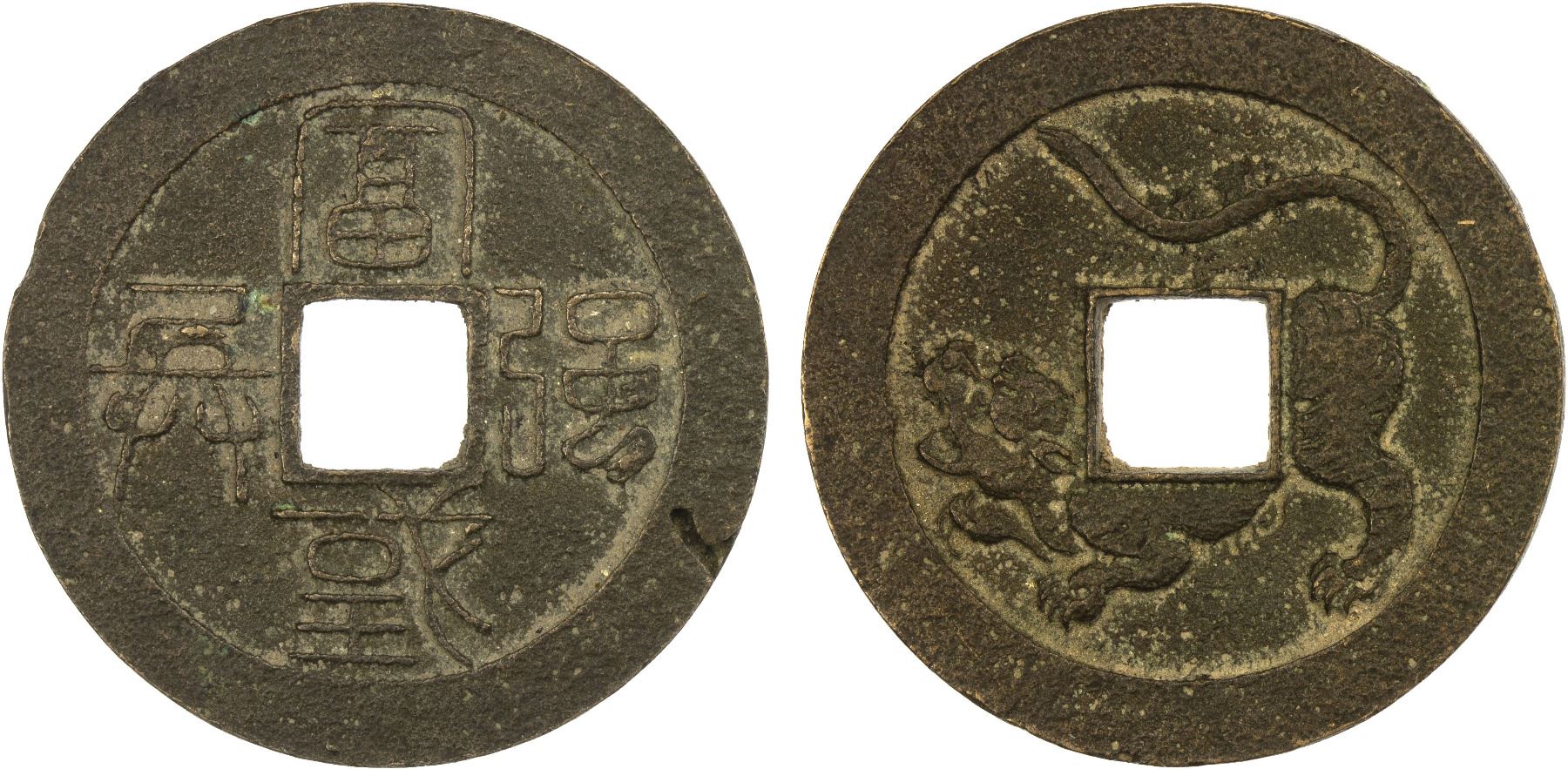 JAPAN: Keio, 1865-1868, AE 50 mon (12.02g), Hosogaya mint in Mito, Hitachi Province, H-7.4, 35mm, type known as a Mito Tora-sen (Mito Tiger Coin), cast in bronze, minor natural casting defect, VF-XF. Legend in seal script translates as "Enrich the Country and Strengthen the Military." Cast at the Hosogaya Mito, Hitachi Province (present day Ibaraki-ken). The original cast in 1864 in iron was a local emergency coin used to pay the workmen at the financially troubled copper coin mint in Mito. In 1867 copper-alloy was cast supposedly from bronze cannon which the daimyo (local feudal lord) had made out of temple bells with which to repel the western barbarians.