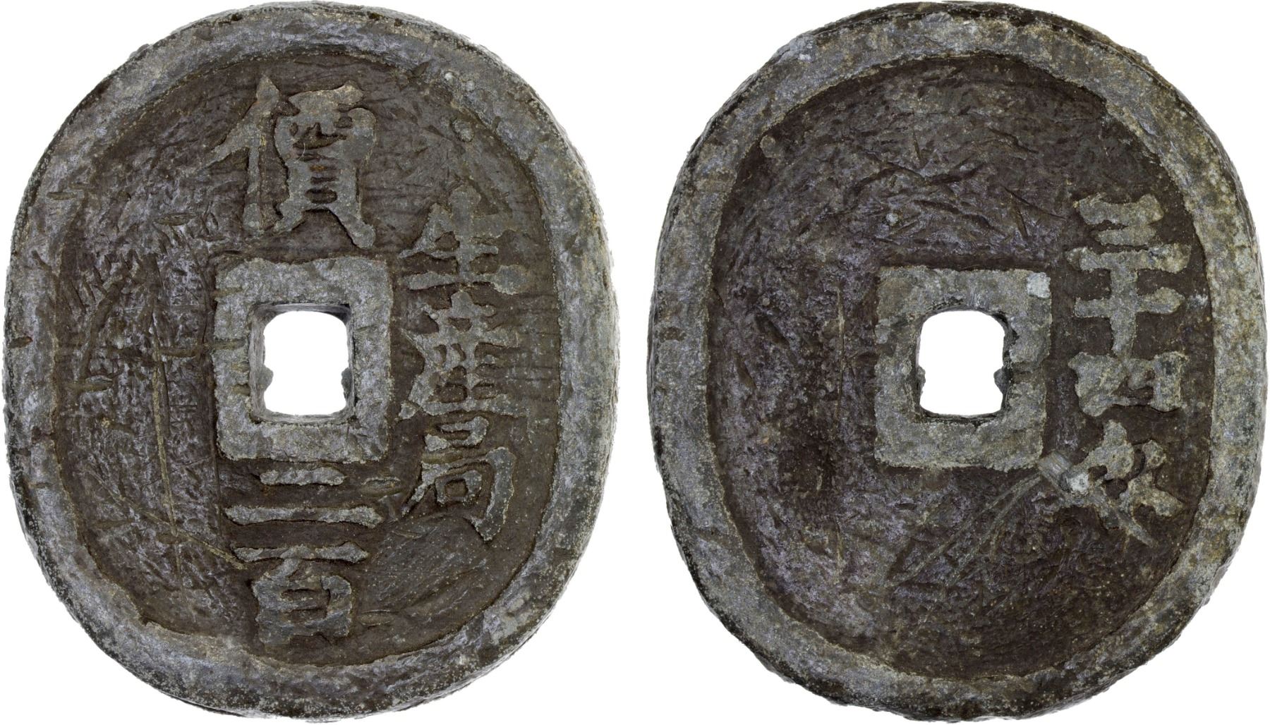 JAPAN: Keio, 1865-1868, lead 200 mon (128.88g), Yonezawa, Dewa Province, H-6.38, JNDA-139.13, atai ni hyaku (value two hundred), sei san kyoko (Production Bureau) at right // sanju shi momme (thirty-four momme), Fine. These lead coins were minted in Yonezawa in Dewa Province, probably around 1866. At this time, the Samurai class found their occupation gone, and in many cases were in great distress. A society was formed under local government supervision to give them aid, and these coins were issued to them.