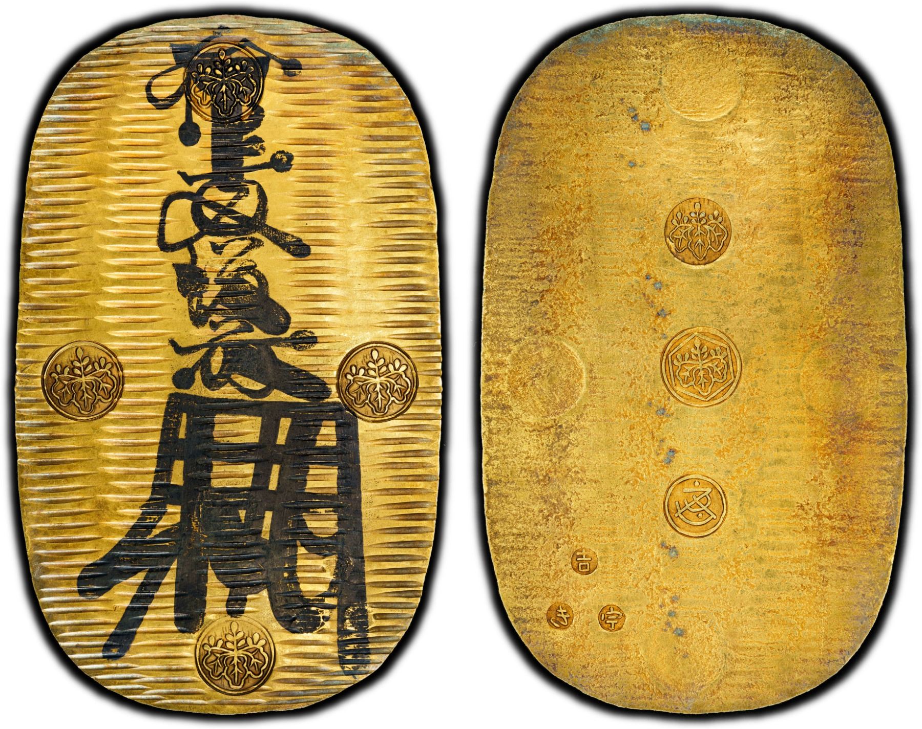 JAPAN: Man'en, 1860-1861, AV oban (112.44g), H-8.13, Cr-24a.2, JNDA-09-11, vertical inscriptions of weight and signature written with black ink with four paulownia circle seals at top, bottom, left, and right // paulownia circle seal top center, paulownia in hexagon and circle at center and circle seal of Kao signature at lower-center, with three circle seals of Mint control characters at lower-left reading Noshime, struck 1860-62 at the Edo or Kyoto Mints, a pleasant lightly toned mint state example! PCGS graded MS61.