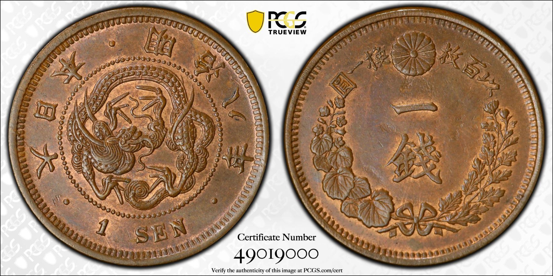 JAPAN: Meiji, 1868-1912, AE sen, year 8 (1875), Y-17.1, dragon with square scales, PCGS graded MS63 BN, ex Almer H. Orr III Collection.